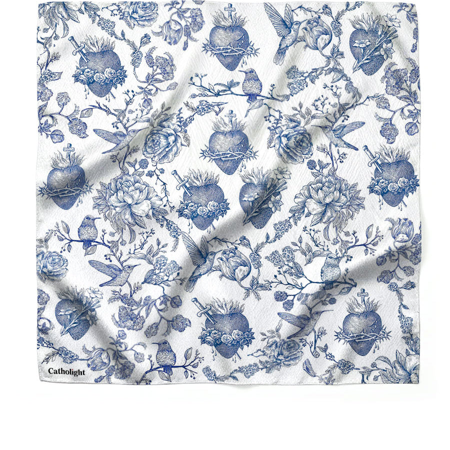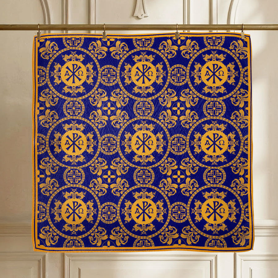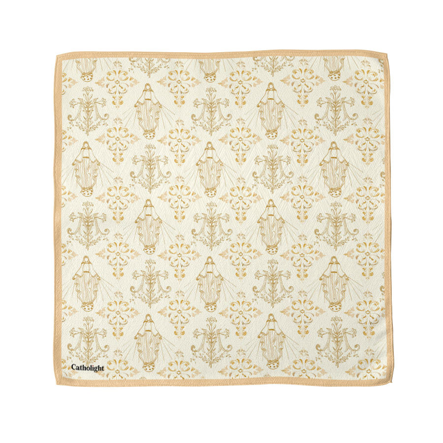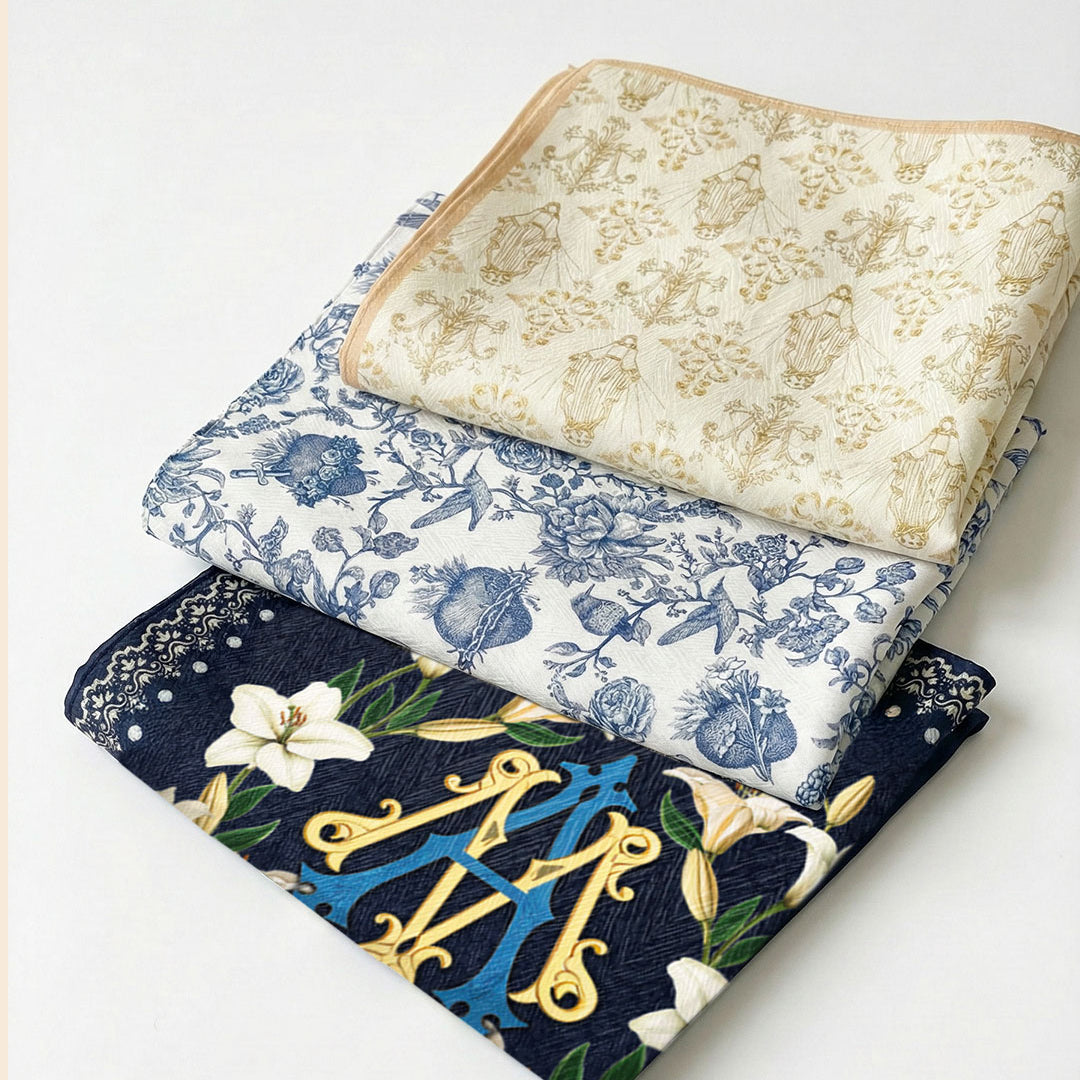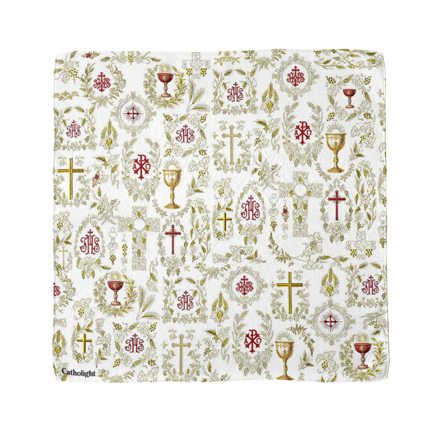 Jedes Stück dieser Kollektion ist wunderschön mit beliebten katholischen Symbolen verziert – Kelch, Kreuz, IHS-Emblem und Olivenzweige –, die in einem zeitlosen Muster kunstvoll angeordnet sind. Der sanfte elfenbeinfarbene Hintergrund in Kombination mit goldenen und weinroten Akzenten schafft einen klassischen Look, der sich nahtlos vom Gottesdienst in den Alltag integrieren lässt.