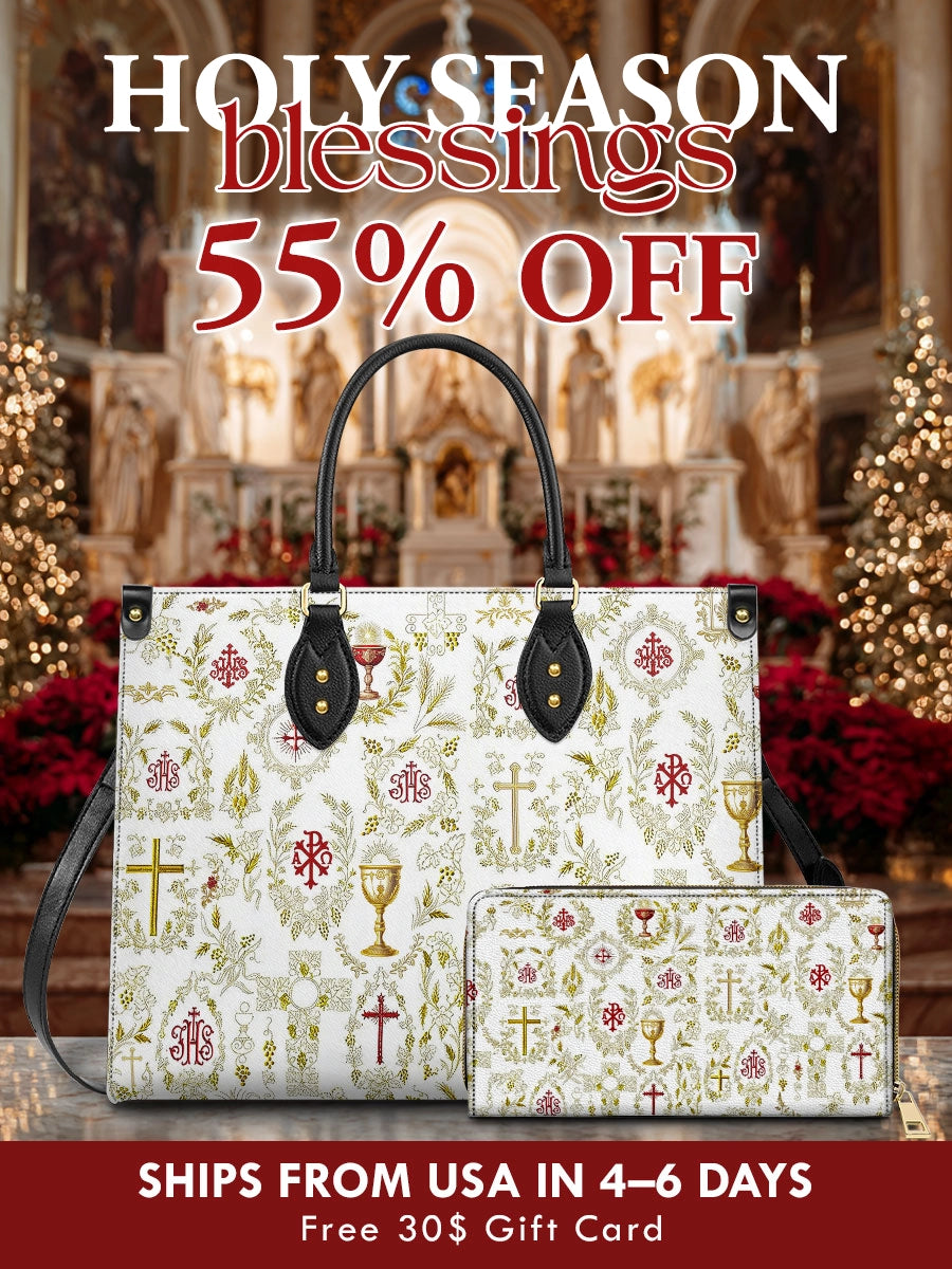 Dieses elegante Set besticht durch fein illustrierte christliche Symbole – Kreuze, Kelche, Lilien, Tauben und Kronen – eine Bildsprache der Frömmigkeit und heiligen Tradition. Es wurde für gläubige Frauen entworfen und verleiht jedem Schritt Bedeutung.