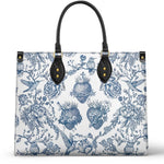 Diese wunderschön gestaltete Ledertasche zeigt ein zeitloses blau-weißes Motiv, das von sakraler Kunst und klassischen Porzellanmustern inspiriert ist. Das Herzstück des Designs zeigt komplizierte Illustrationen der Heiligen und Unbefleckten Herzen, die göttliche Liebe, Opferbereitschaft und Mitgefühl symbolisieren. Um die Herzen herum sind zarte Blumenarrangements, darunter Rosen und Lilien, die Reinheit, Hingabe und ewige Gnade darstellen.