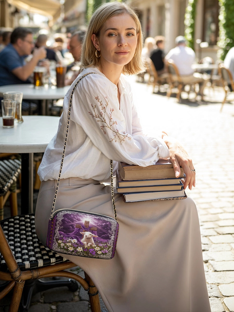 Die Catholight Crossbody Bag wurde mit Eleganz und Bedacht entworfen. Sie ist ein stiller Ausdruck von Glaube und Eleganz. Ihre kompakte Form, der goldverzierte Kettenriemen und die symbolische Gestaltung machen sie zu einem bedeutungsvollen Begleiter im Alltag und in besonderen Momenten.