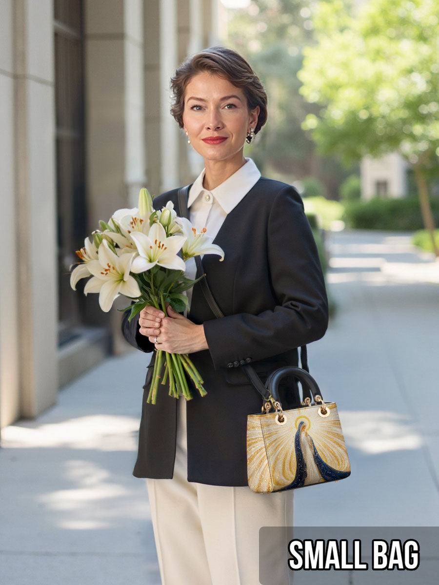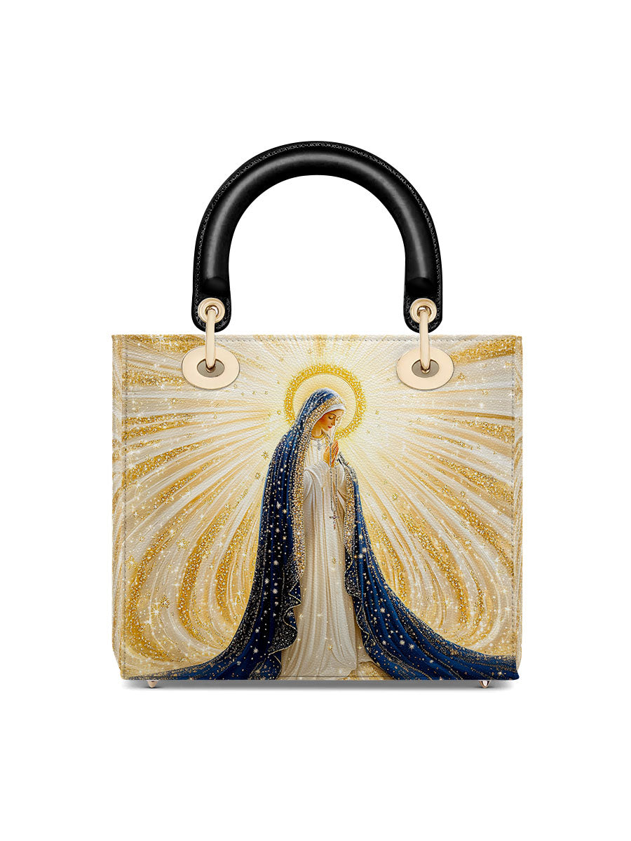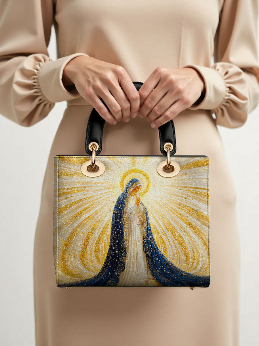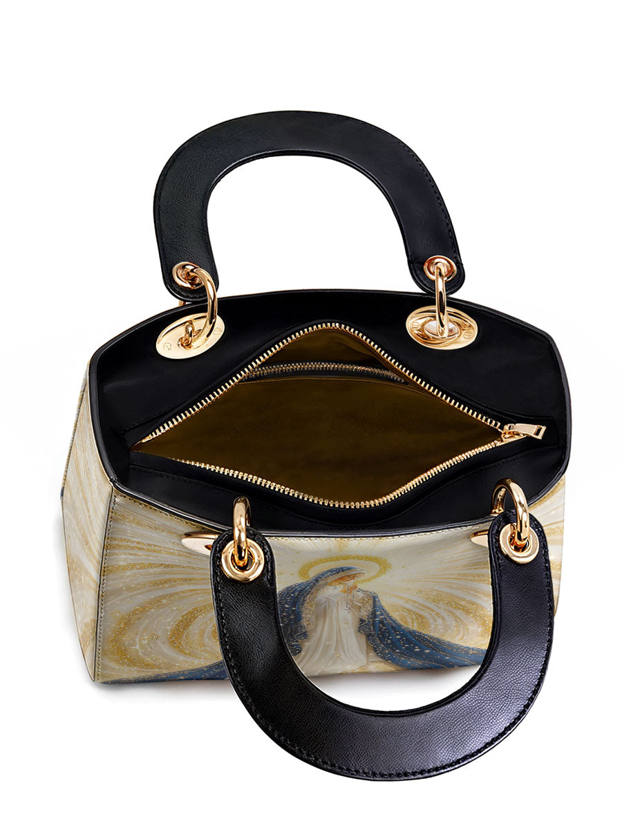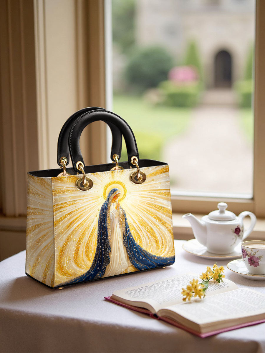Diese exquisite Ledertasche zeigt ein atemberaubendes Bild der Heiligen Jungfrau Maria, umgeben von strahlenden Strahlen göttlichen Lichts. Ihr fließender tiefblauer Schleier, geschmückt mit schimmernden goldenen Akzenten, symbolisiert Reinheit, Anmut und ihre Rolle als Königin des Himmels. Das Kunstwerk strahlt spirituelle Schönheit aus, wobei die leuchtenden Strahlen Hoffnung, Glauben und Gottes leitende Gegenwart darstellen. Diese aus hochwertigem Leder gefertigte Tasche verbindet zeitlose Eleganz mit bedeutungsvoller Hingabe.