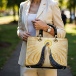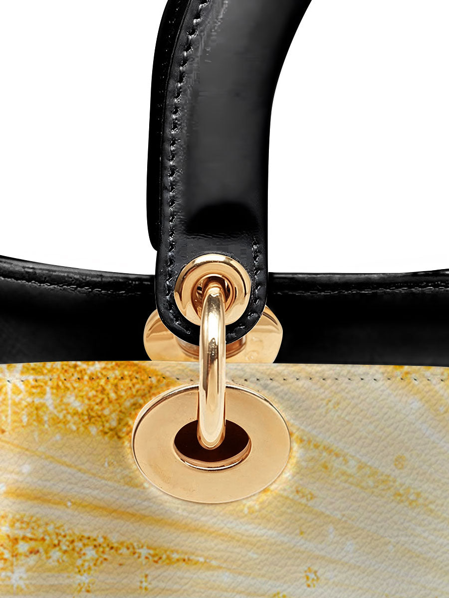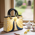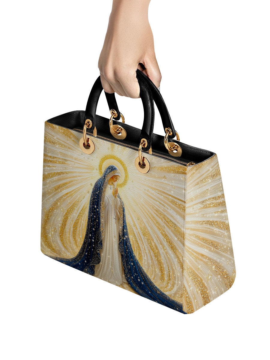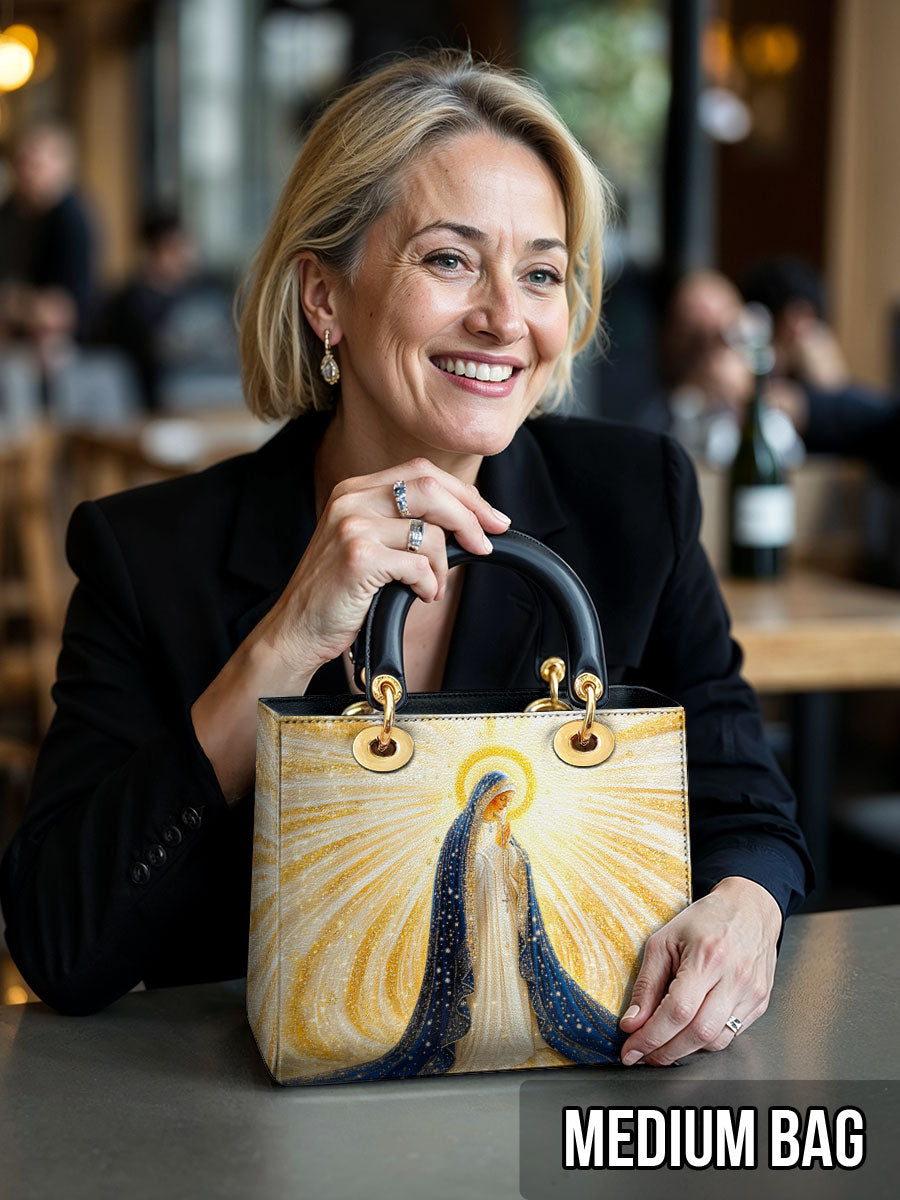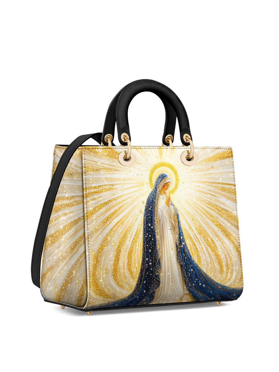 Diese exquisite Ledertasche zeigt ein atemberaubendes Bild der Heiligen Jungfrau Maria, umgeben von strahlenden Strahlen göttlichen Lichts. Ihr fließender tiefblauer Schleier, geschmückt mit schimmernden goldenen Akzenten, symbolisiert Reinheit, Anmut und ihre Rolle als Königin des Himmels. Das Kunstwerk strahlt spirituelle Schönheit aus, wobei die leuchtenden Strahlen Hoffnung, Glauben und Gottes leitende Gegenwart darstellen. Diese aus hochwertigem Leder gefertigte Tasche verbindet zeitlose Eleganz mit bedeutungsvoller Hingabe.