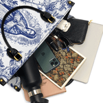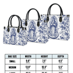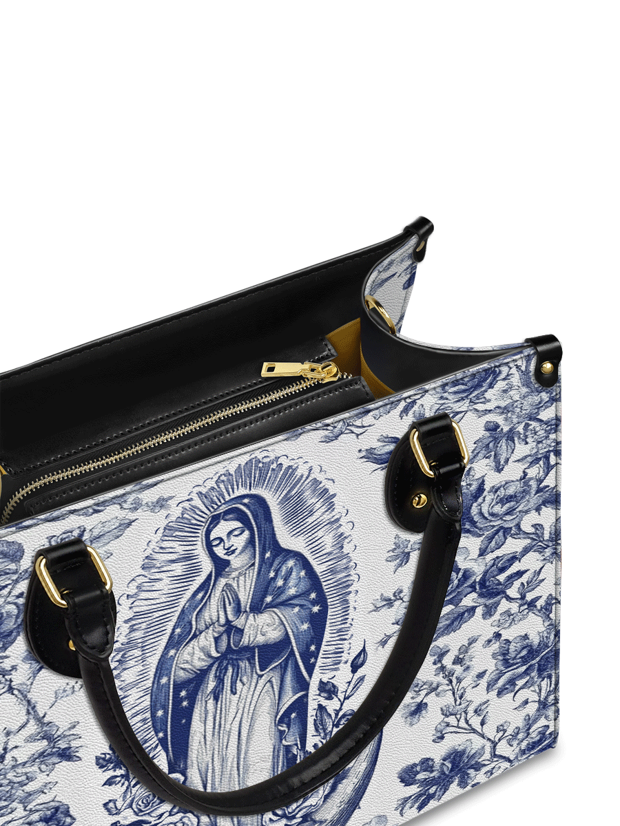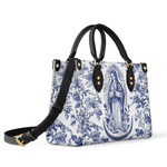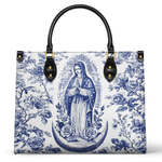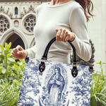 Die Lederhandtasche „Sacred Serenity Virgin Mary“ ist eine wunderschön gestaltete Tasche, die Glauben, Eleganz und Kunstfertigkeit vereint. Gefertigt aus hochwertigem Leder, besticht diese Tote Bag durch ein klassisches blau-weißes Toile-de-Jouy-Muster, verziert mit einer anmutigen Darstellung der Jungfrau Maria, Symbol für Frieden und Hingabe. Die strukturierte Silhouette, akzentuiert durch goldfarbene Beschläge und schwarze Ledergriffe, verleiht ihr einen Hauch von Raffinesse. Diese Tasche vereint Stil und Funktionalität und ist perfekt für alle, die ihren Glauben stilvoll und modisch zum Ausdruck bringen möchten.