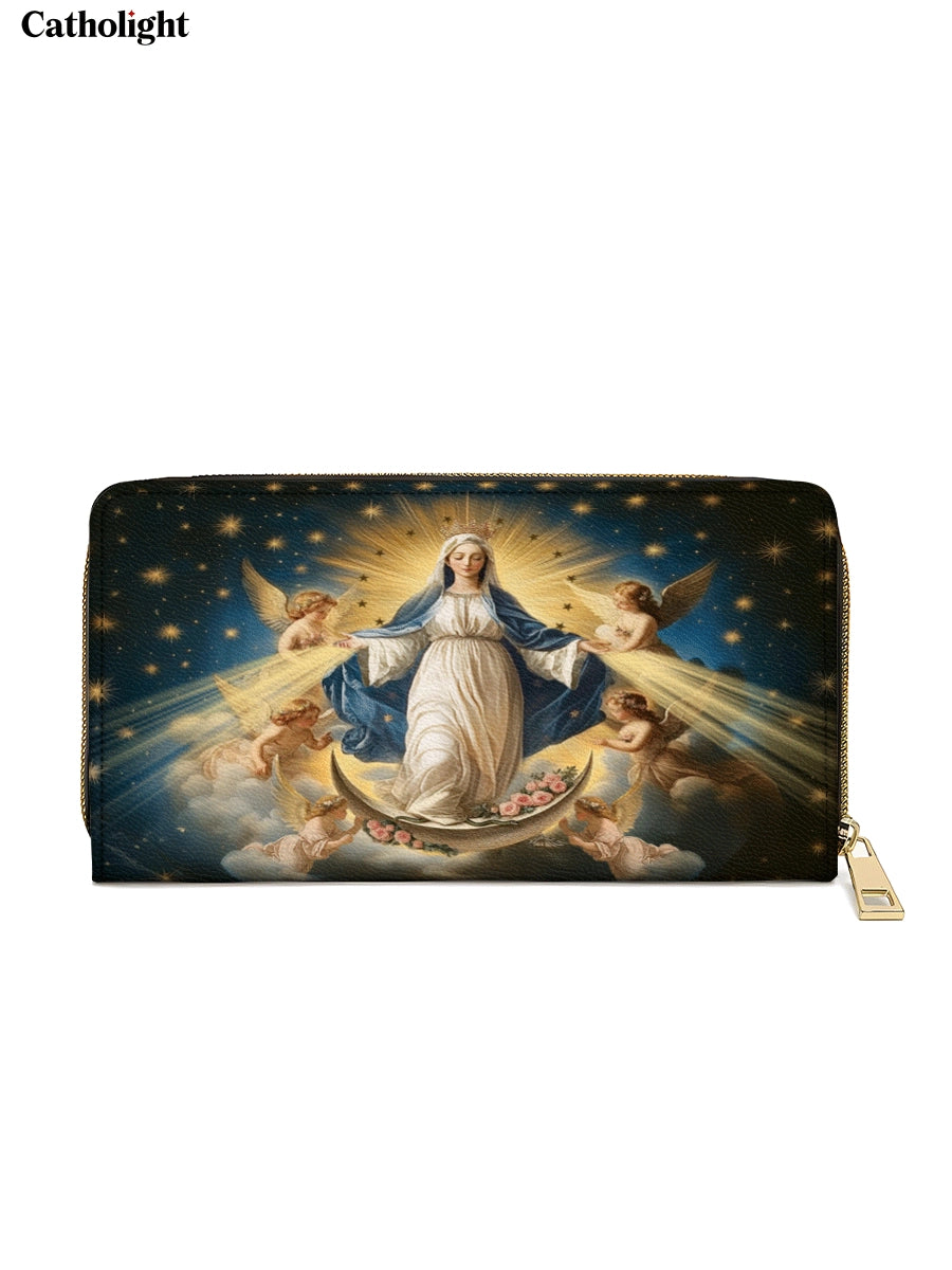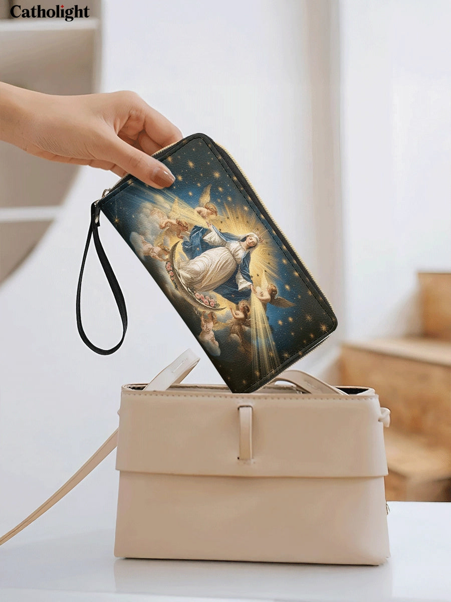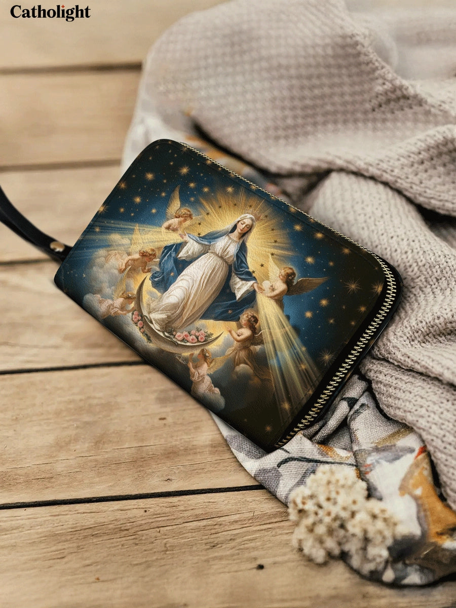 Erleben Sie die göttliche Ausstrahlung der Ledergeldbörse „Queen of Heaven“ , eine exquisite Hommage an die himmlische Herrlichkeit der Heiligen Jungfrau Maria. Diese Geldbörse zeigt das majestätische Bild der Himmelfahrt, mit Maria, geschmückt in himmlisches Licht, umgeben von engelhaften Engeln und einem Himmel voller schimmernder Sterne. Die aufwendige Kunstfertigkeit fängt ihre Anmut, Reinheit und zeitlose Hingabe ein.