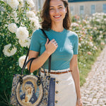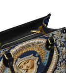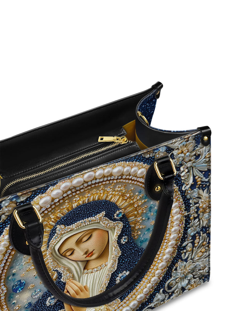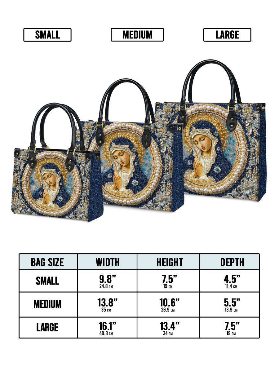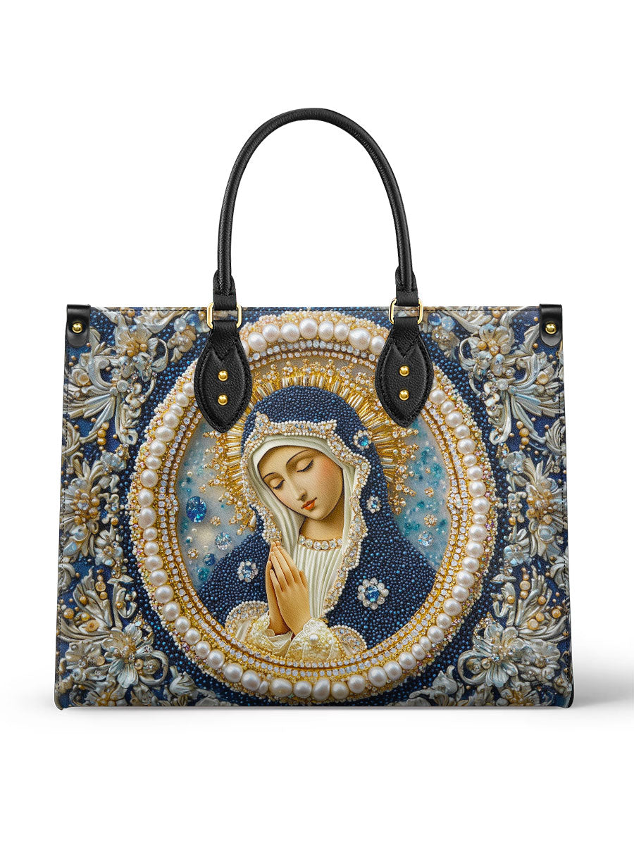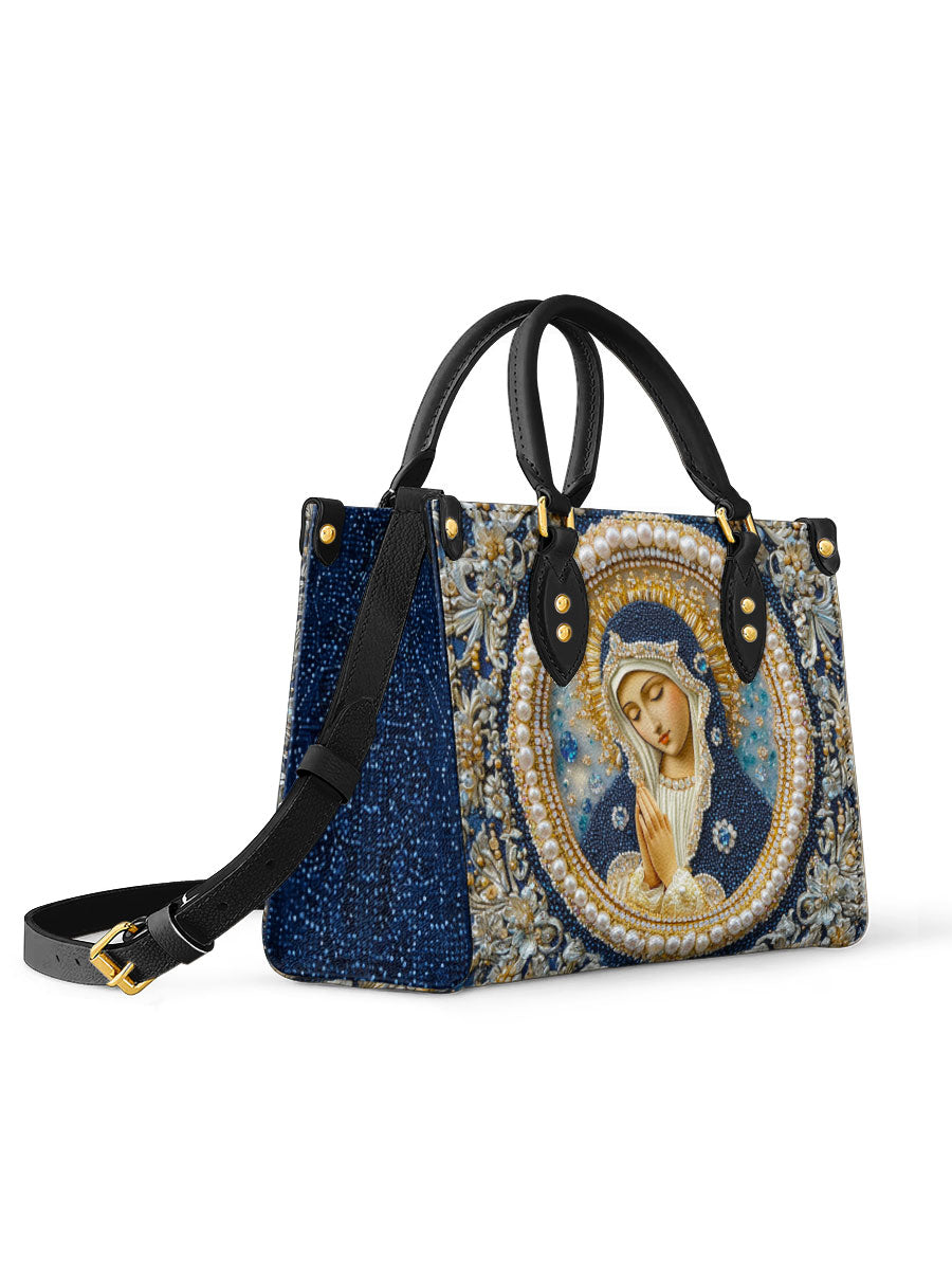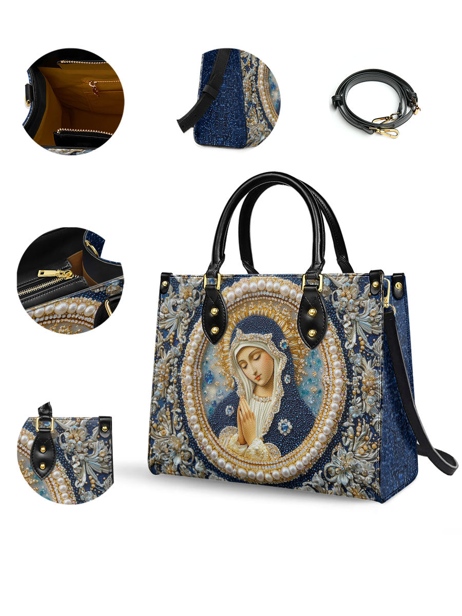 Ein Design, inspiriert von der stillen Schönheit des Gebets und der Andacht. Diese Tasche fängt die sanfte Ausstrahlung der Jungfrau Maria ein, deren Gesicht in friedvoller Ehrfurcht gesenkt ist und Mitgefühl und göttliche Ruhe ausstrahlt. Umgeben von himmlischem Licht und marianischen Blautönen verkörpert sie eine Botschaft der Hoffnung, des Glaubens und der weiblichen Anmut.