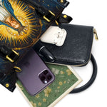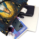 Diese elegante Ledertasche zeigt eine atemberaubende Darstellung der Heiligen Jungfrau Maria, umgeben von einer strahlenden goldenen Aura, die ihre göttliche Rolle als Königin des Himmels symbolisiert. In fließende blaue und weiße Gewänder gekleidet, vermittelt Marias heiterer Ausdruck Anmut, Frieden und mütterliche Liebe. Zwei Engelsgestalten knien in Ehrfurcht zu ihren Füßen und betonen ihre himmlische Autorität und mitfühlende Fürsprache. Der satte mitternachtsblaue Hintergrund mit zarten goldenen Akzenten spiegelt die unendliche Schönheit des Himmels wider und macht diese Ledertasche zu einem zeitlosen Ausdruck von Glauben und Hingabe.