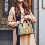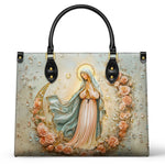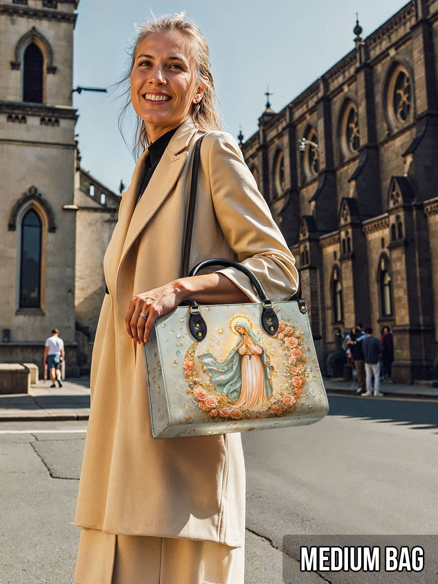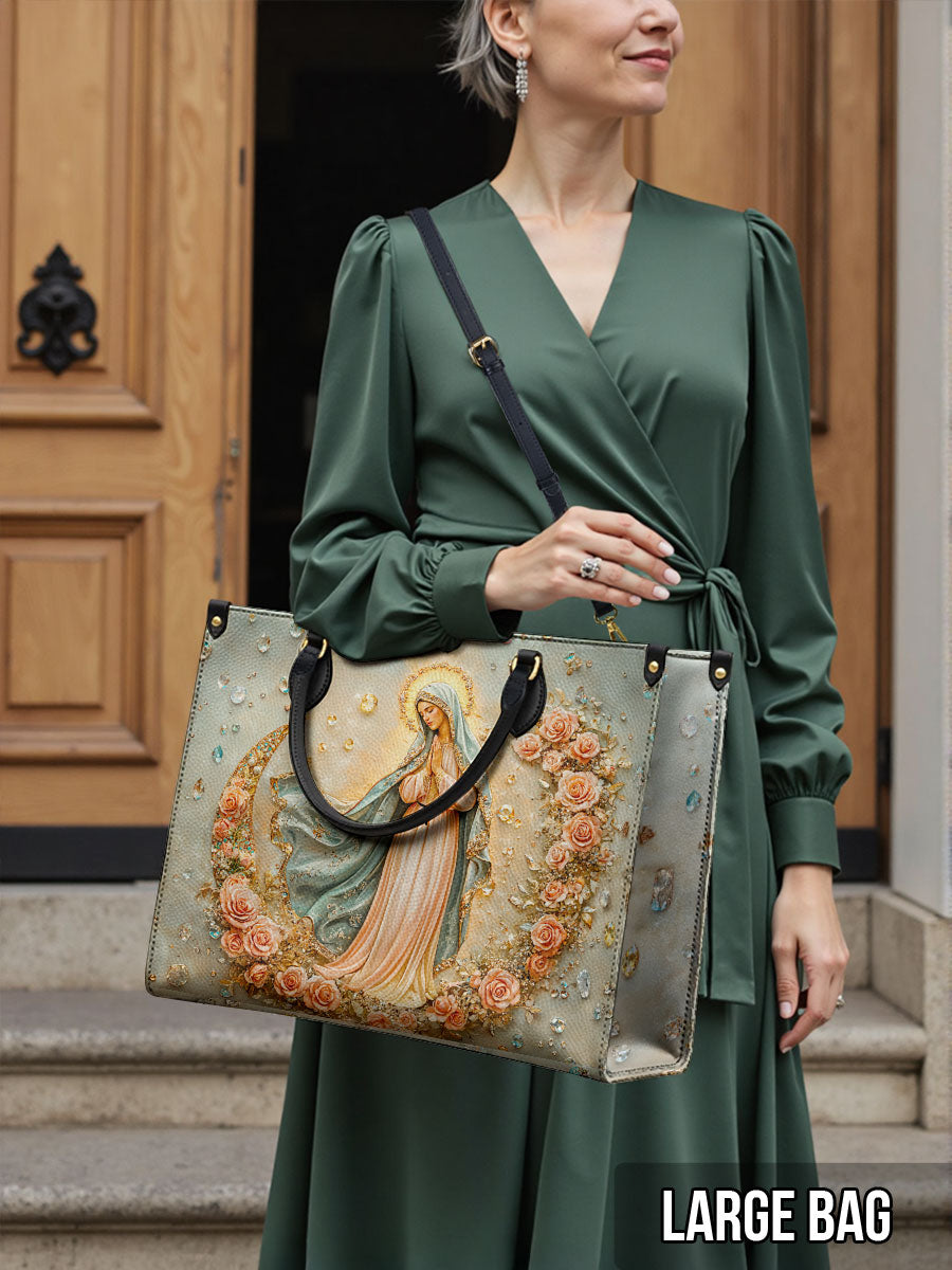Diese exquisite Ledertasche zeigt ein ruhiges Bild der Heiligen Jungfrau Maria, die anmutig auf einer Mondsichel steht, umgeben von zarten Rosen und sanftem goldenen Licht. Das Kunstwerk symbolisiert auf wunderschöne Weise Marias Reinheit, Demut und ihre Rolle als Königin des Himmels. Die komplizierten Details ihres fließenden Schleiers und die sanften Pastelltöne rufen Frieden, Anmut und göttliche Liebe hervor und schaffen ein bedeutungsvolles Stück, das Glauben und Hingabe ausstrahlt.