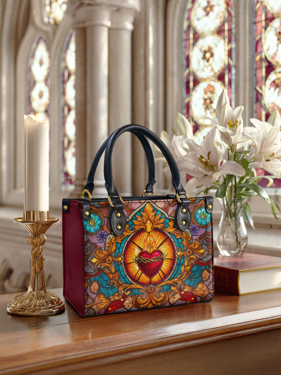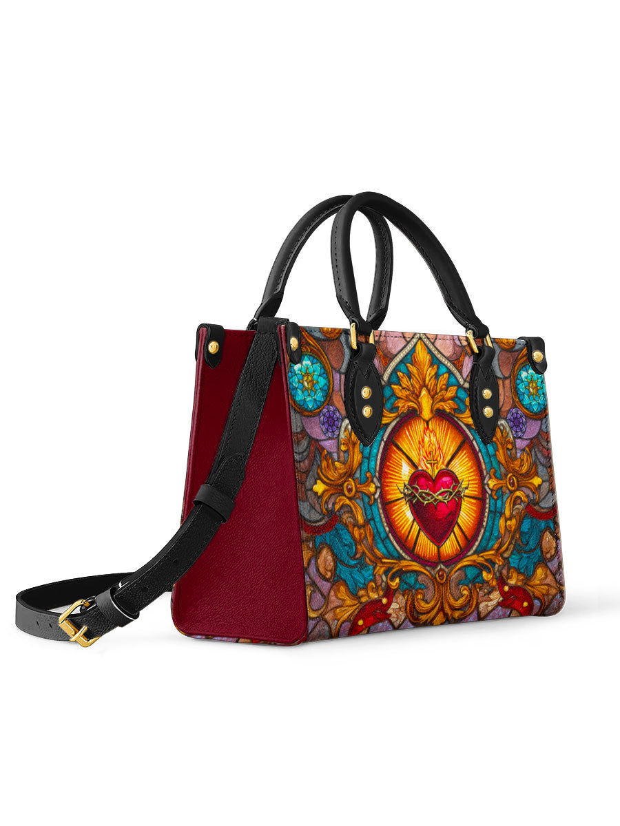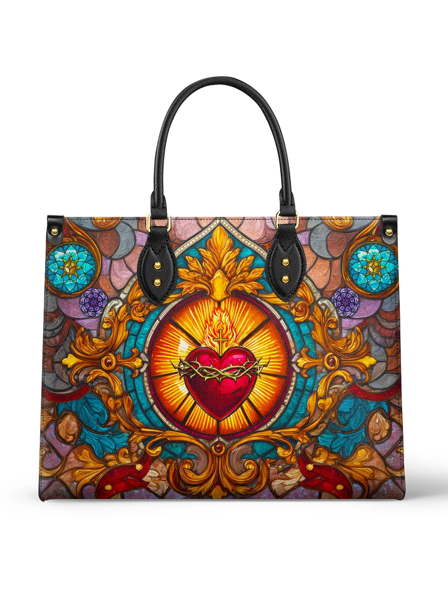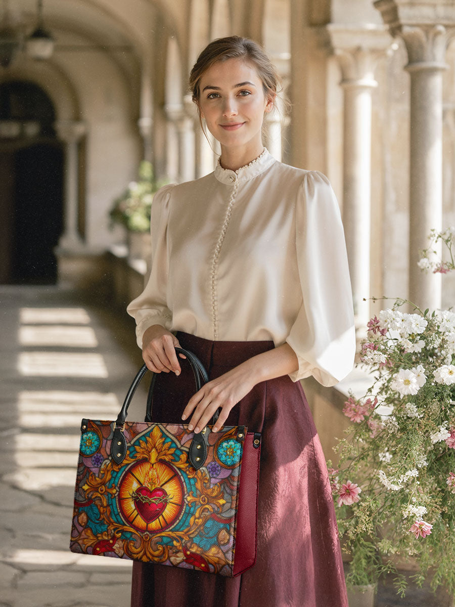 Diese exquisite Handtasche präsentiert das Heilige Herz Jesu in leuchtender Glasmalerei – ein zeitloses Symbol göttlicher Liebe, Opferbereitschaft und Barmherzigkeit. Das strahlende Herz, gekrönt mit Dornen und erleuchtet von himmlischem Licht, erinnert an Christi unerschütterliches Mitgefühl.