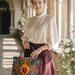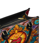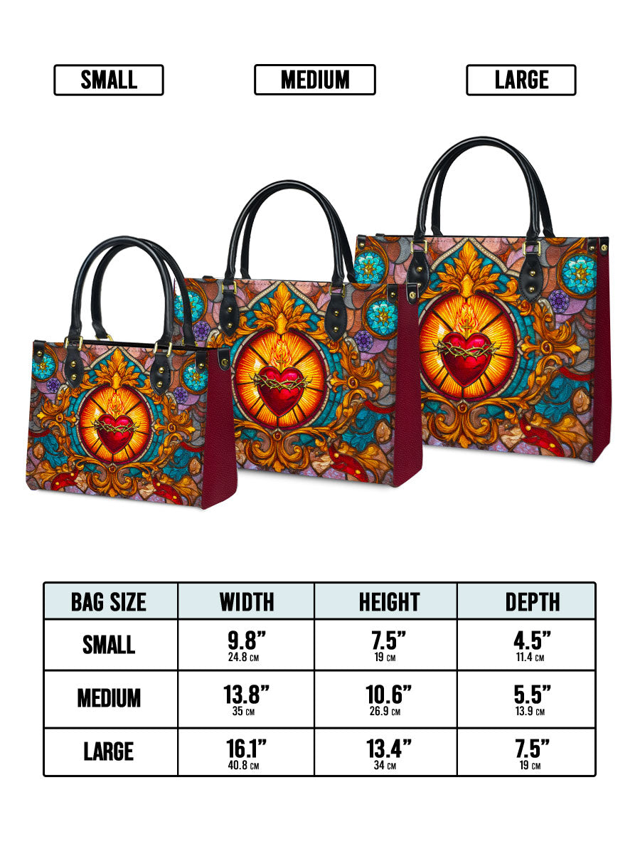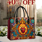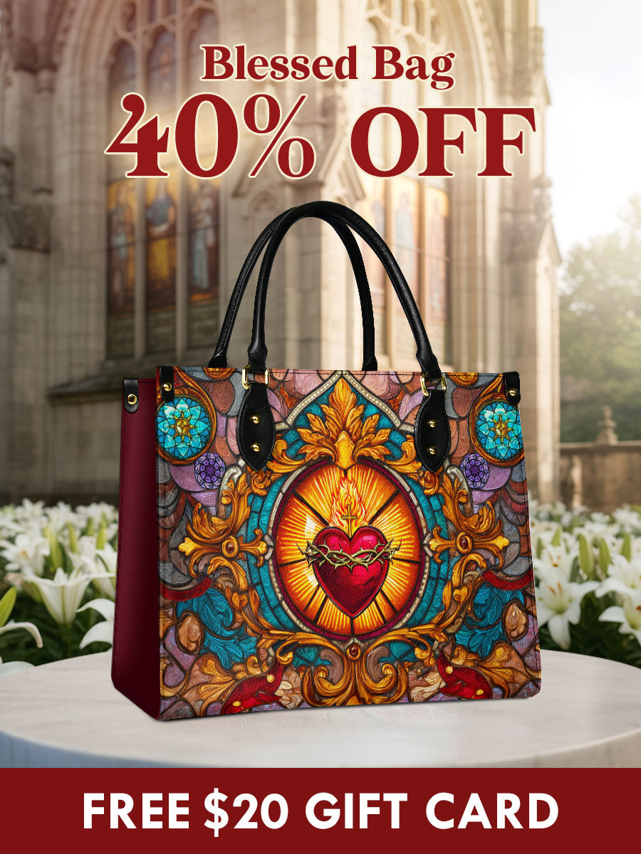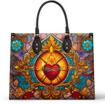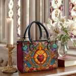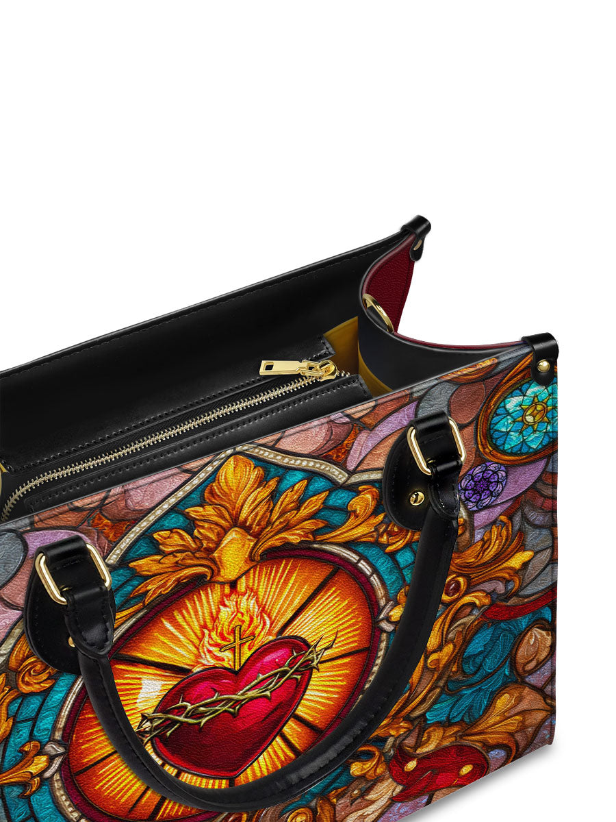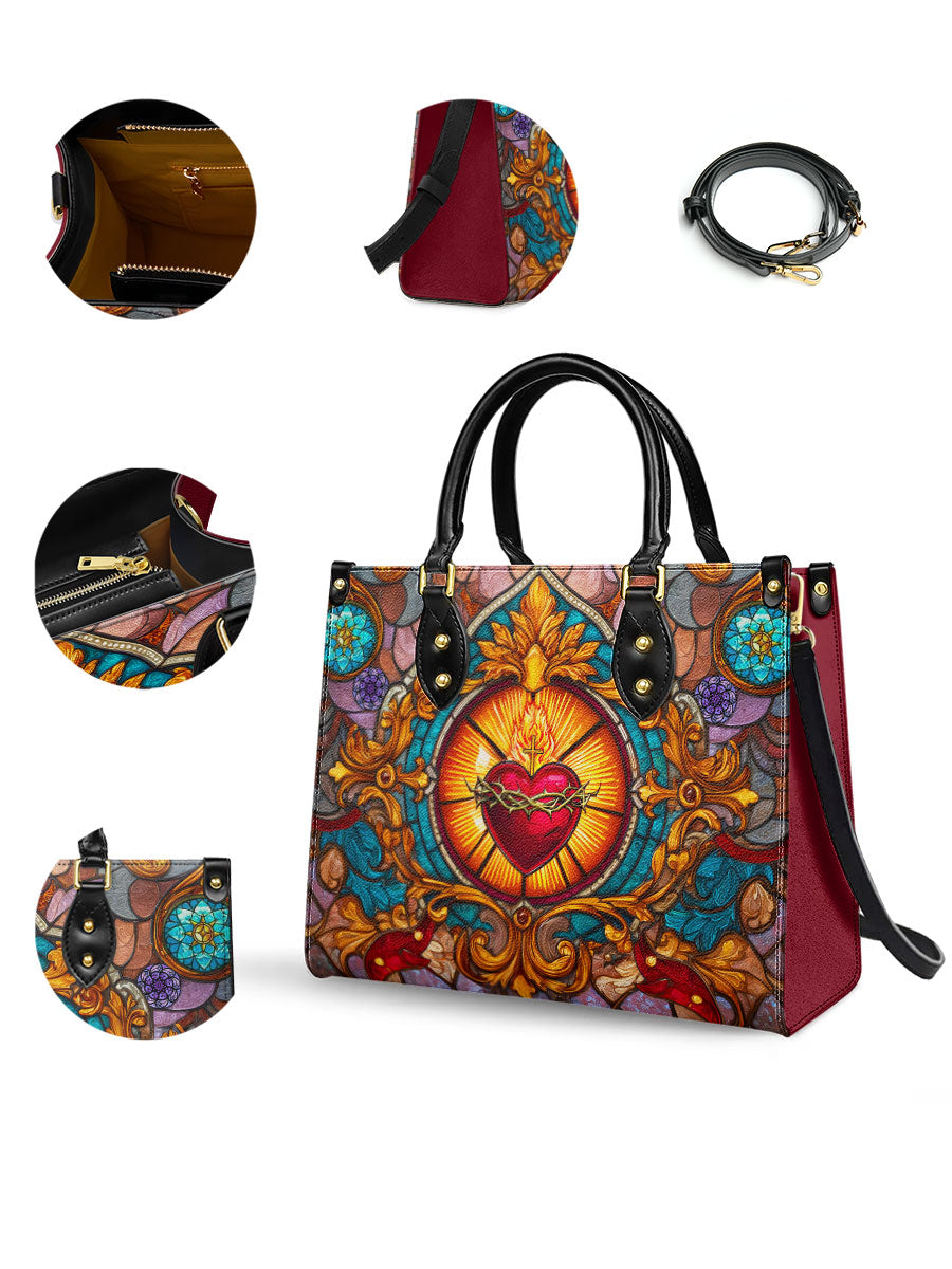 Diese exquisite Handtasche präsentiert das Heilige Herz Jesu in leuchtender Glasmalerei – ein zeitloses Symbol göttlicher Liebe, Opferbereitschaft und Barmherzigkeit. Das strahlende Herz, gekrönt mit Dornen und erleuchtet von himmlischem Licht, erinnert an Christi unerschütterliches Mitgefühl.