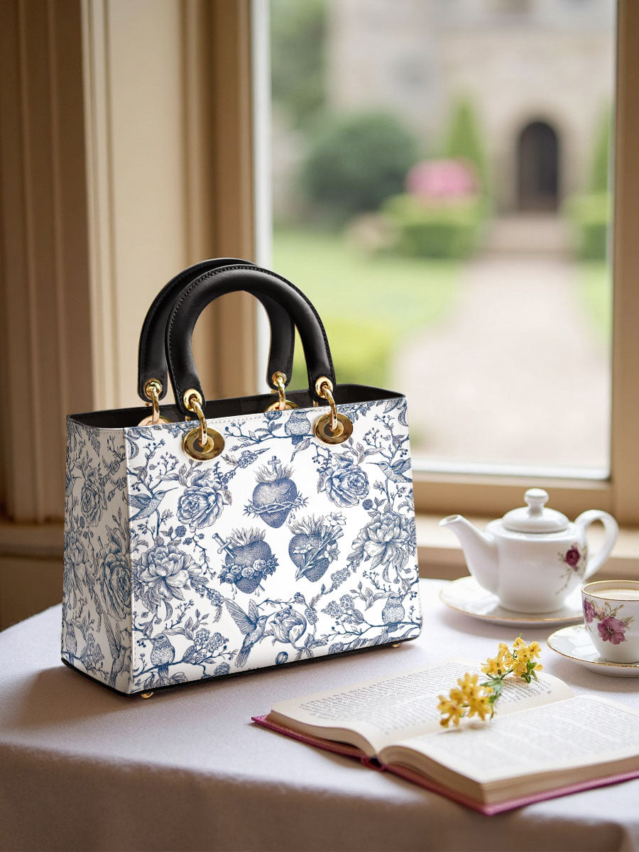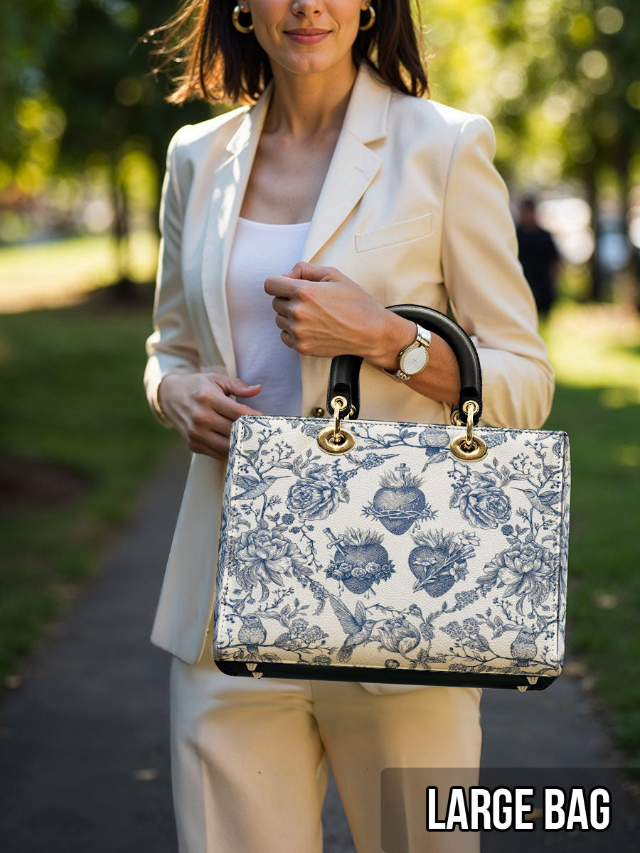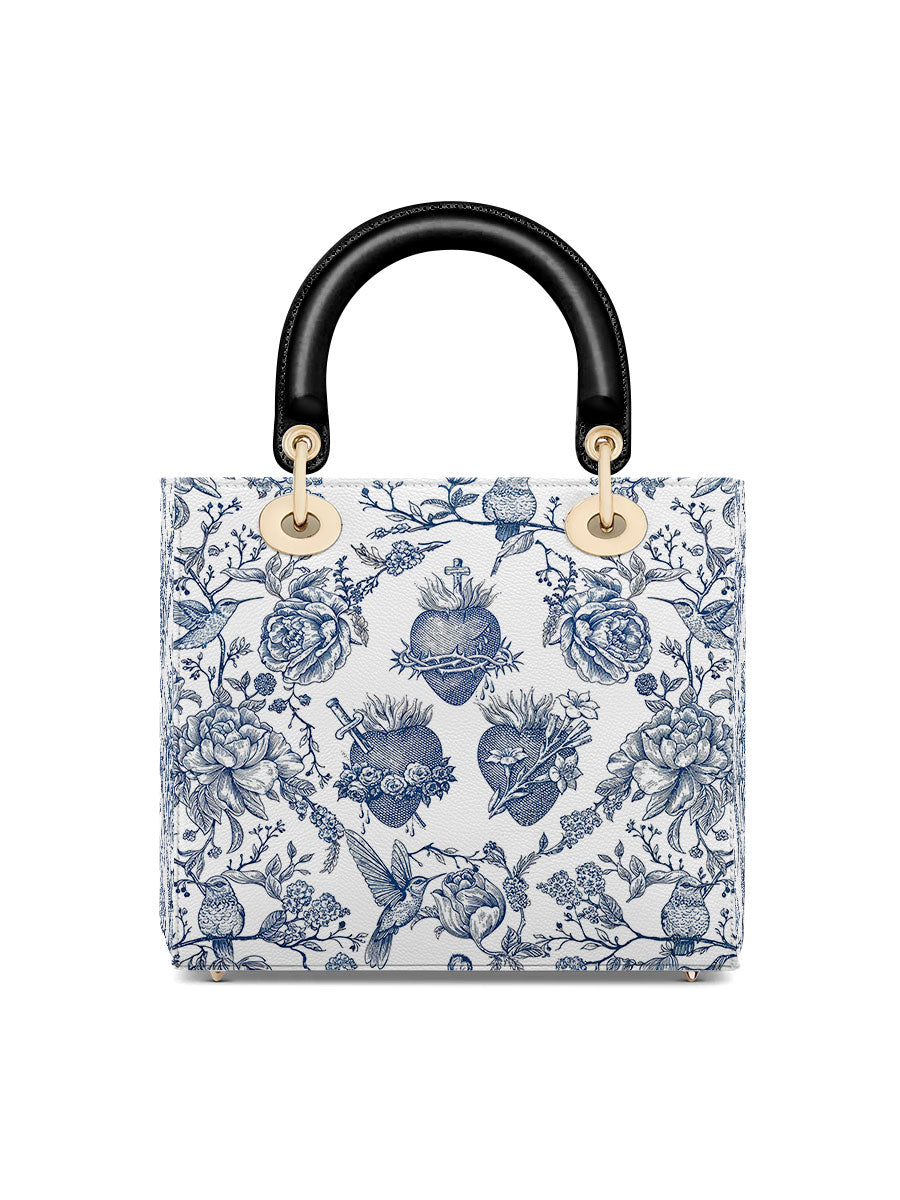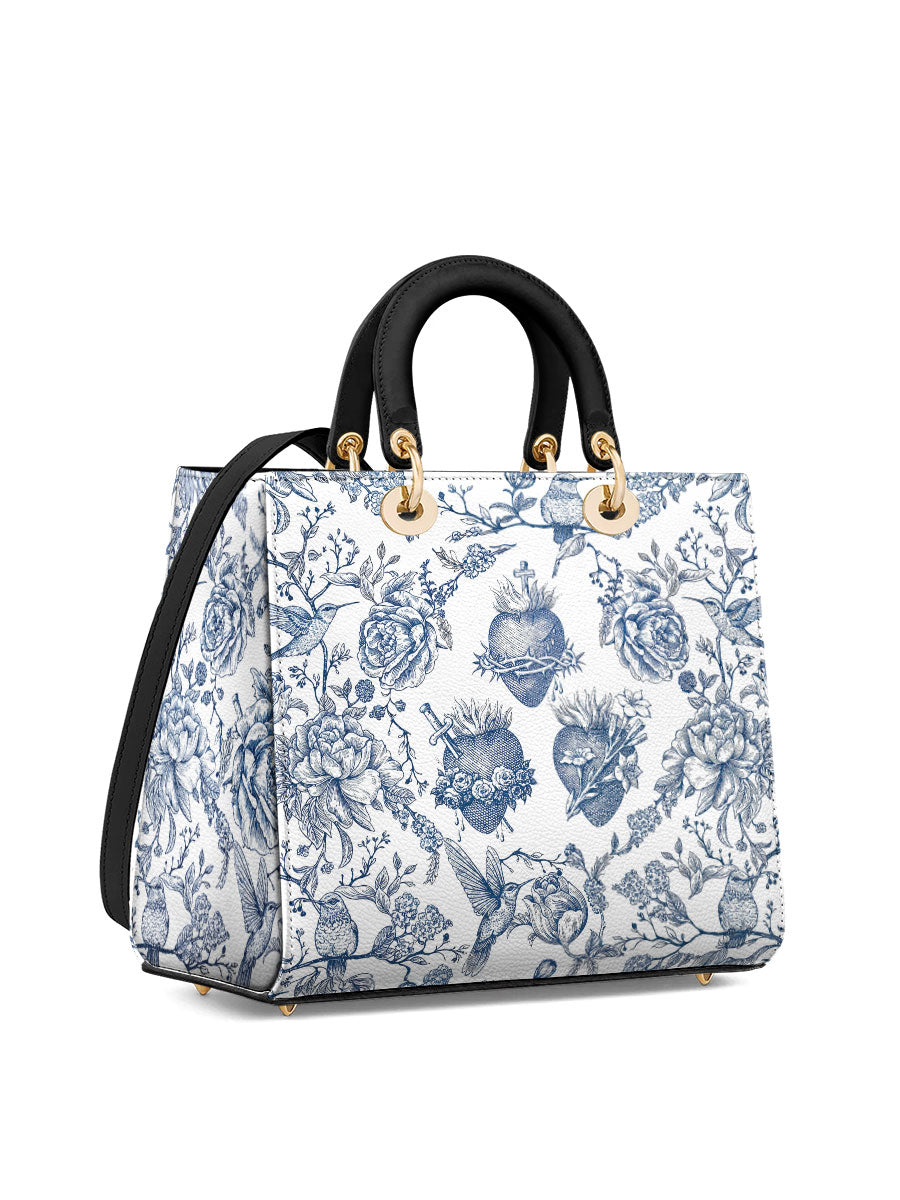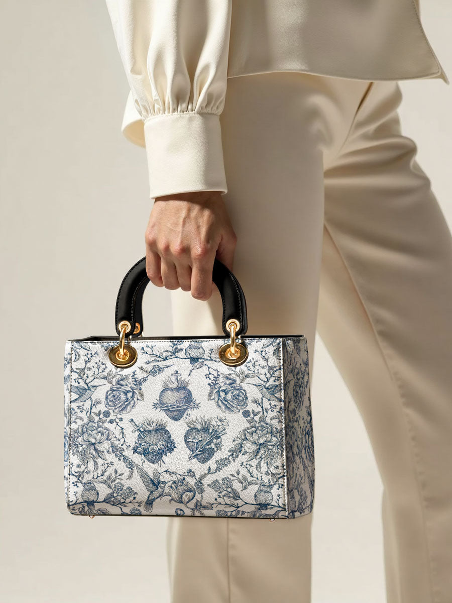 Diese elegante Lederhandtasche besticht durch eine anmutige Illustration im Toile-de-Jouy-Stil in klassischem Blau und Weiß, die das Heiligste Herz Jesu, das Unbefleckte Herz Mariens und das Reine Herz des Heiligen Josef detailreich darstellt. Umgeben von blühenden Rosen, Dornen und Lilien, vermittelt das Motiv ein zeitloses Gefühl von Hingabe, Reinheit und Liebe, die in der Heiligen Familie verwurzelt sind.