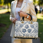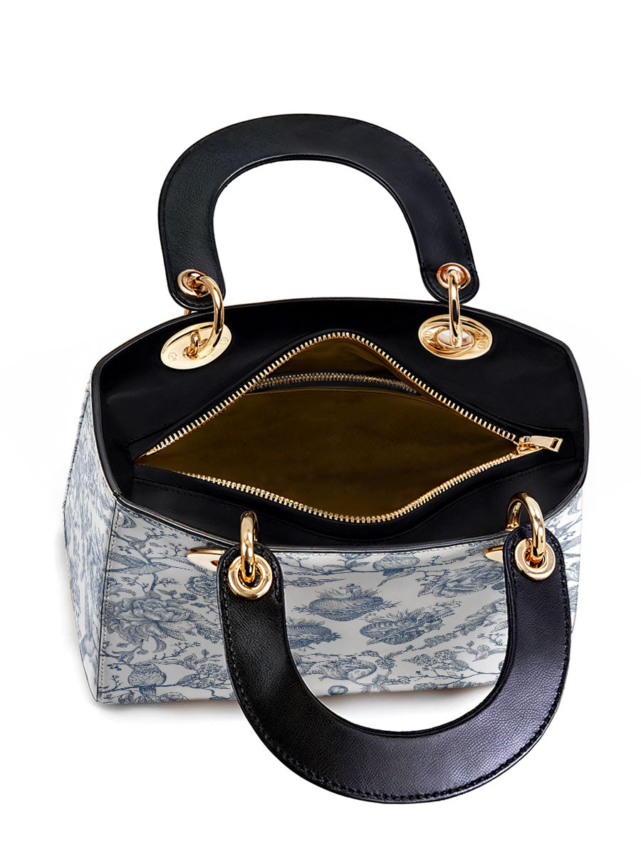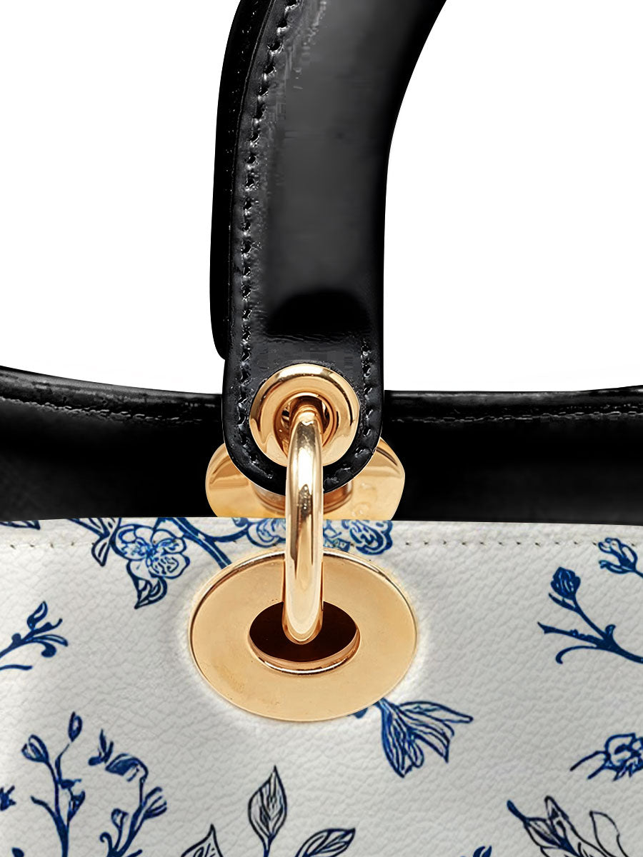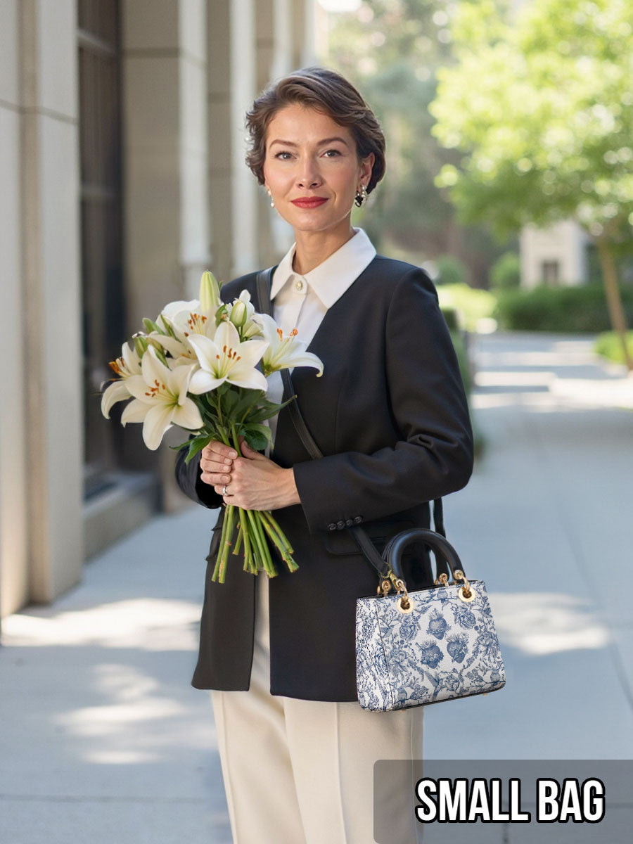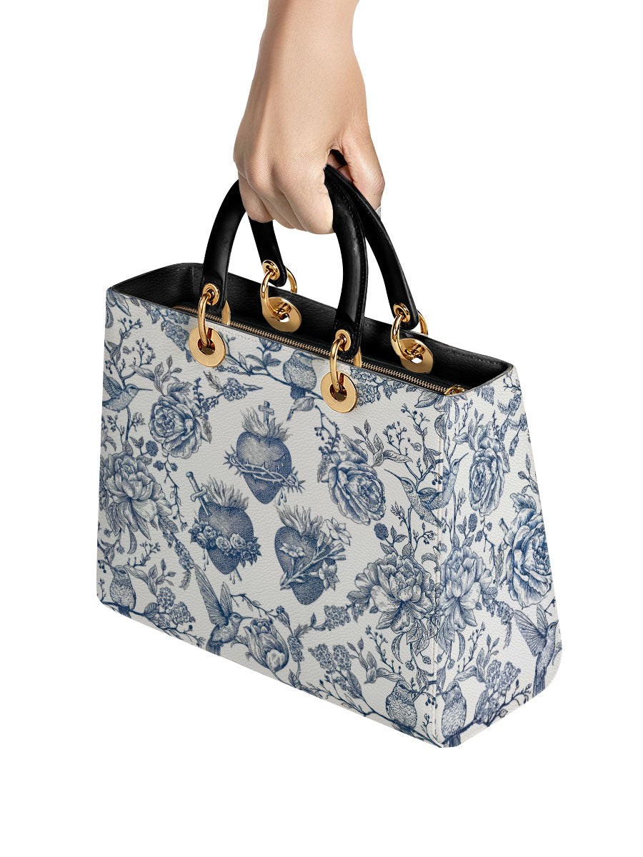 Diese elegante Lederhandtasche besticht durch eine anmutige Illustration im Toile-de-Jouy-Stil in klassischem Blau und Weiß, die das Heiligste Herz Jesu, das Unbefleckte Herz Mariens und das Reine Herz des Heiligen Josef detailreich darstellt. Umgeben von blühenden Rosen, Dornen und Lilien, vermittelt das Motiv ein zeitloses Gefühl von Hingabe, Reinheit und Liebe, die in der Heiligen Familie verwurzelt sind.