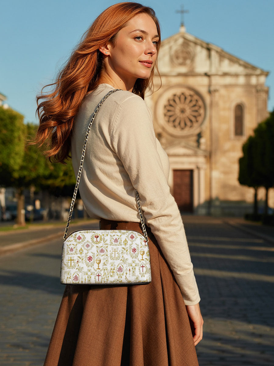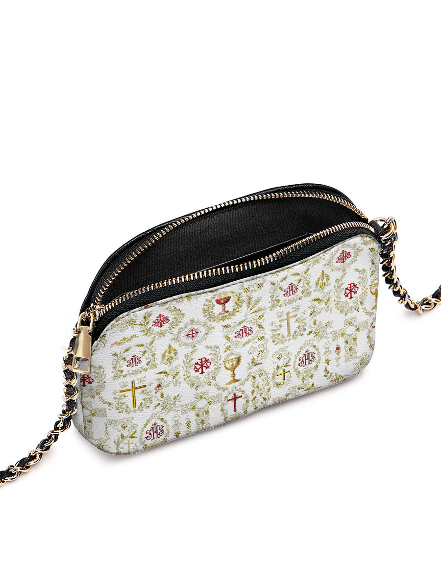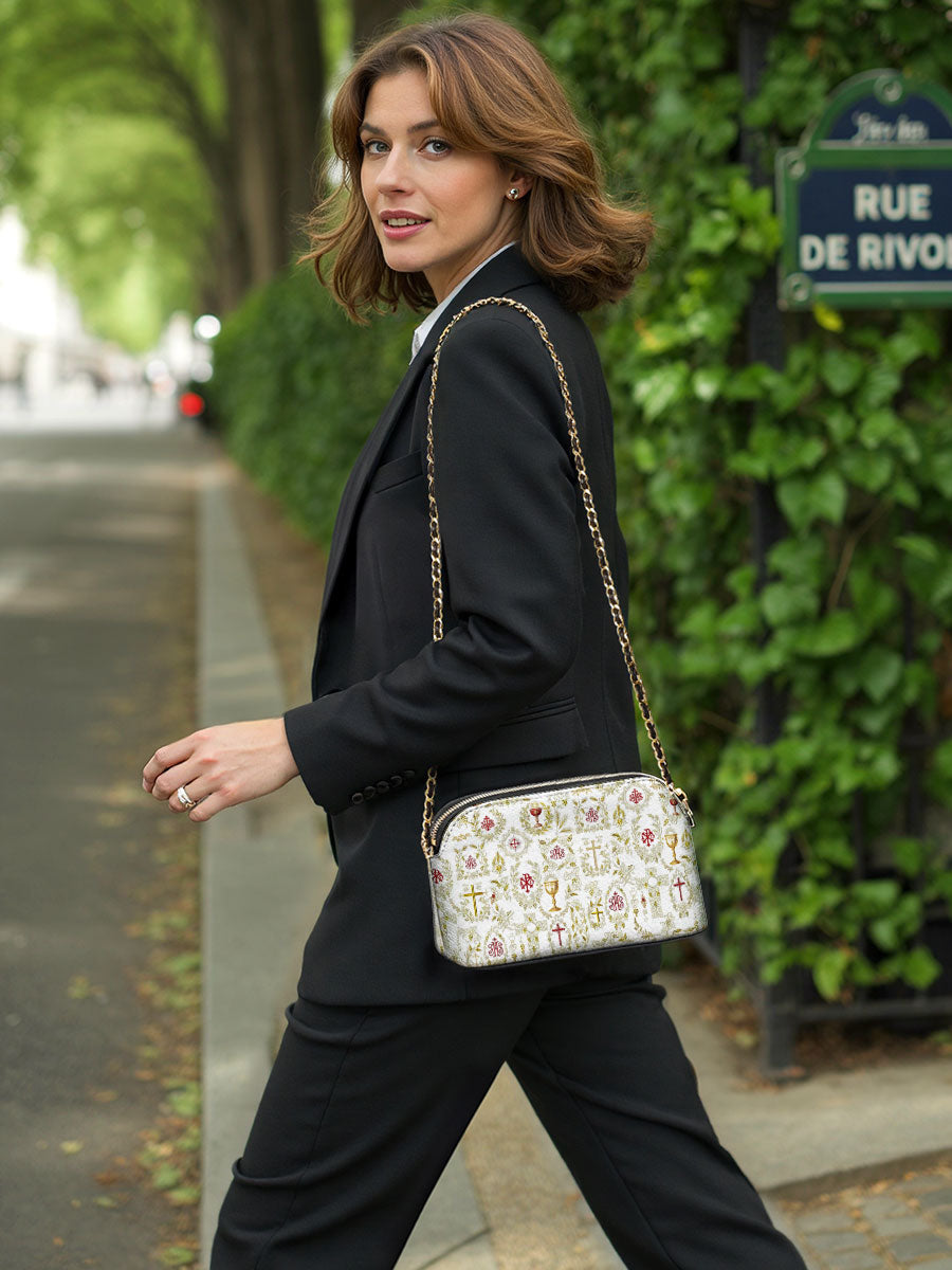 Die Catholight Crossbody Bag wurde mit Eleganz und Bedacht entworfen. Sie ist ein stiller Ausdruck von Glaube und Eleganz. Ihre kompakte Form, der goldverzierte Kettenriemen und die symbolische Gestaltung machen sie zu einem bedeutungsvollen Begleiter im Alltag und in besonderen Momenten.