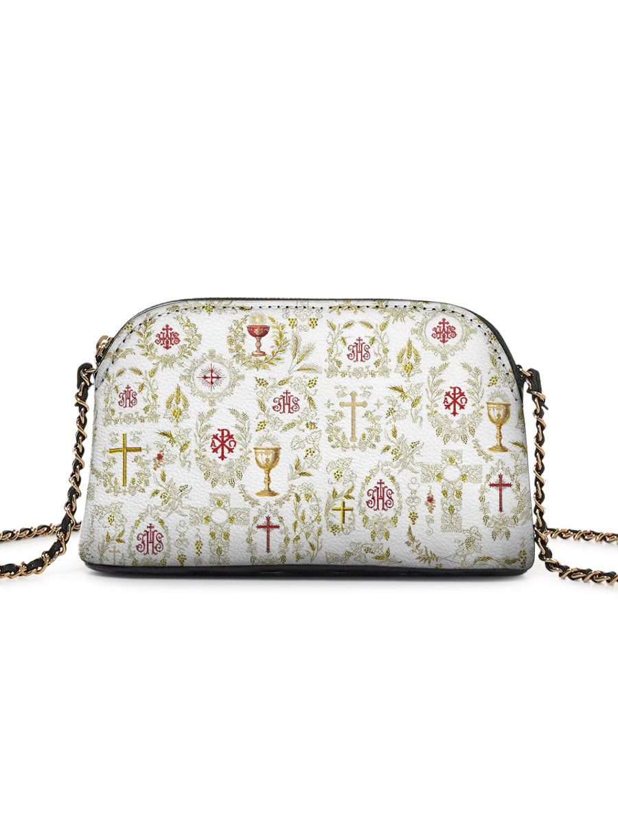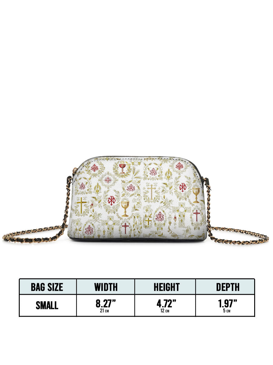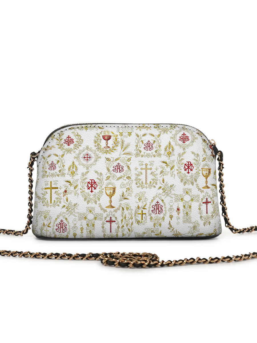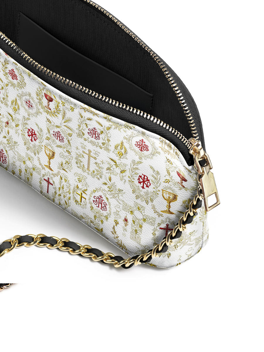 Die Catholight Crossbody Bag wurde mit Eleganz und Bedacht entworfen. Sie ist ein stiller Ausdruck von Glaube und Eleganz. Ihre kompakte Form, der goldverzierte Kettenriemen und die symbolische Gestaltung machen sie zu einem bedeutungsvollen Begleiter im Alltag und in besonderen Momenten.