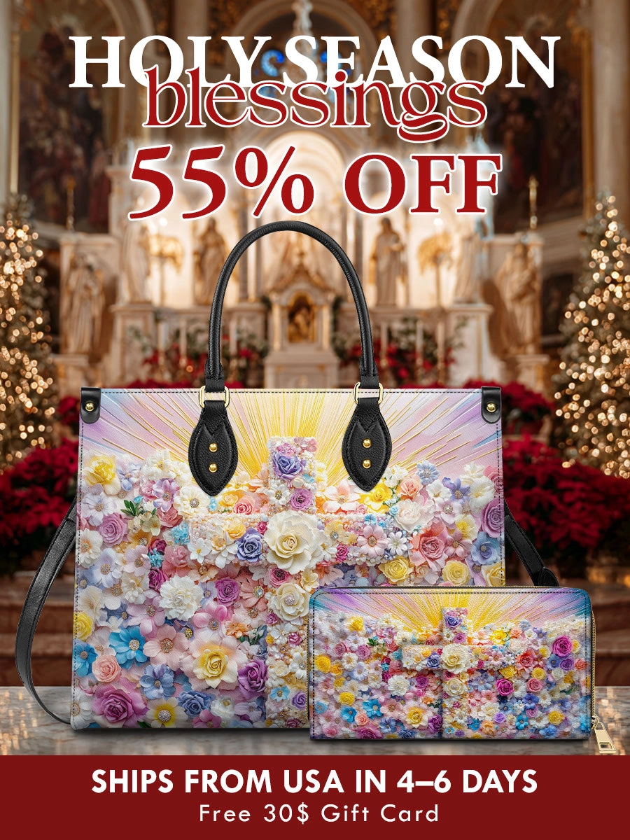 Carry beauty with light. This radiant set captures the joyful spirit of creation, featuring a blooming tapestry of flowers bathed in golden light — a subtle reflection of divine renewal and hope. It’s designed for women who walk with both faith and grace.