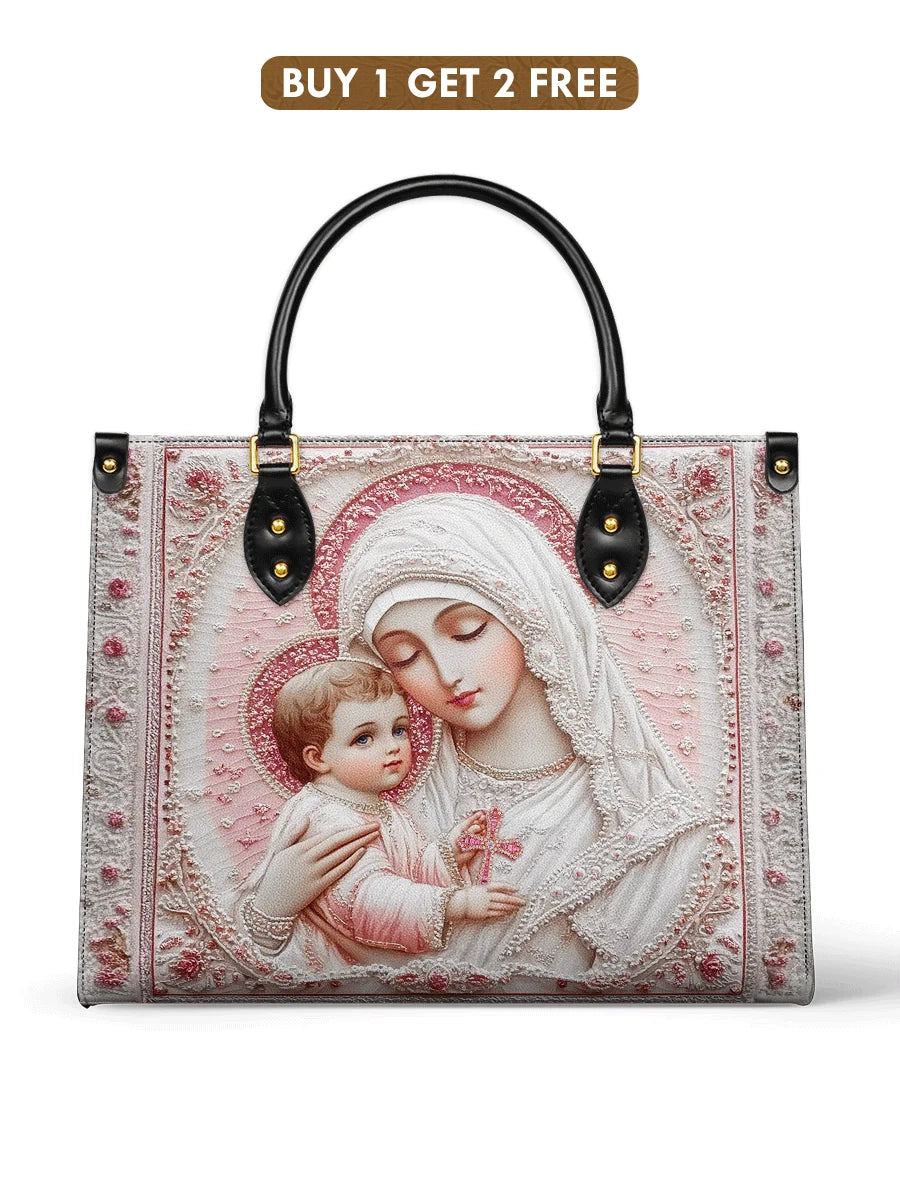 Sacred Serenity: The Madonna’s Tender Embrace Leather Bag is a masterpiece of faith and elegance, featuring an exquisite depiction of the Virgin Mary cradling Baby Jesus in a moment of divine love and devotion. Wrapped in soft hues of ivory and blush pink, this design radiates serenity, warmth, and grace. Intricate details and ornate textures enhance the ethereal beauty, making this bag a perfect blend of spirituality and timeless luxury.