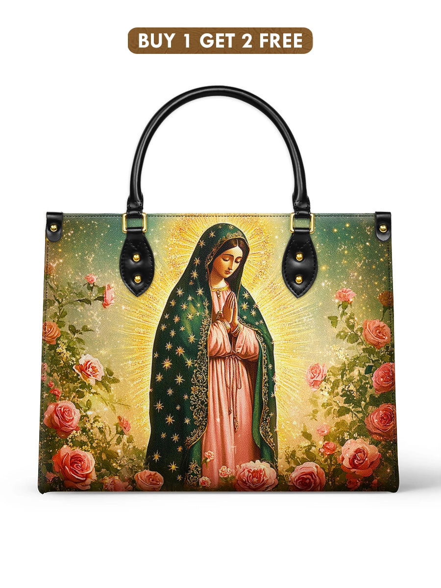 This stunning leather bag features a radiant depiction of Our Lady of Guadalupe, surrounded by a halo of golden light that symbolizes her divine grace and compassion. Dressed in her iconic emerald green mantle adorned with delicate stars, and a soft rose-colored gown, the Blessed Virgin stands in a serene posture of prayer, exuding peace and maternal love. Vibrant pink roses bloom around her, reflecting the miraculous roses of her apparition to Saint Juan Diego, symbolizing faith, hope, and the beauty of God’s miracles.