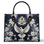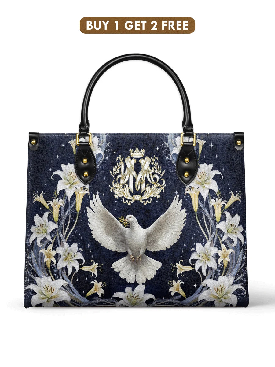 This beautifully designed leather bag embodies spiritual devotion, featuring a radiant depiction of the Holy Spirit represented by the pure white dove at its center. The dove, with outstretched wings, symbolizes peace, divine guidance, and the presence of the Holy Spirit in our lives.