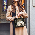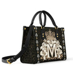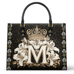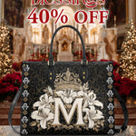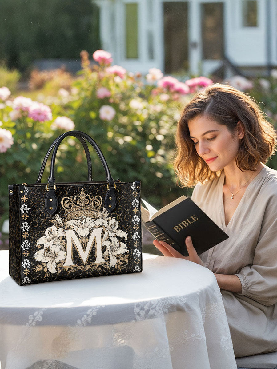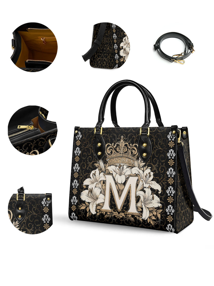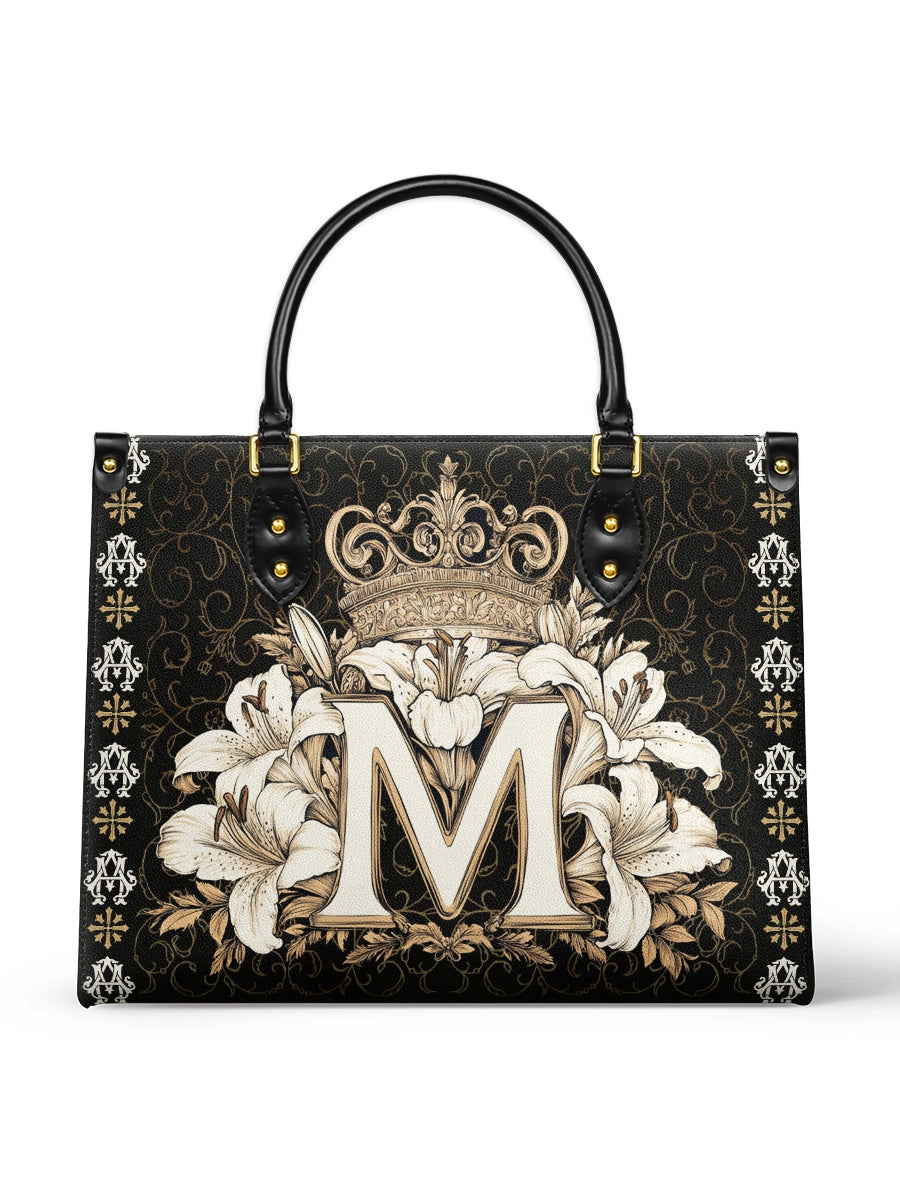 The "Divine Monogram Leather Bag" is a striking tribute to the Blessed Virgin Mary, featuring a majestic "M" monogram encircled by radiant white lilies and crowned with an ornate golden crown. The rich black background and intricate decorative patterns emphasize the regal beauty and sacred symbolism of the design, representing Mary's purity, grace, and her role as the Queen of Heaven.