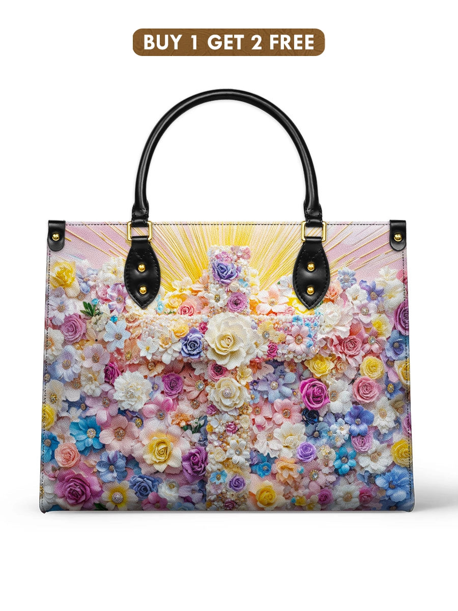 This vibrant leather bag features a stunning cross made entirely of colorful blooming flowers, symbolizing the beauty of resurrection, renewal, and divine love. Radiant golden light emanates from behind the cross, highlighting its sacred significance and creating a sense of hope and spiritual upliftment. The pastel hues of pink, blue, yellow, and white flowers reflect joy, grace, and faith, making this design a celebration of life and faith.