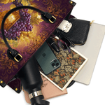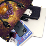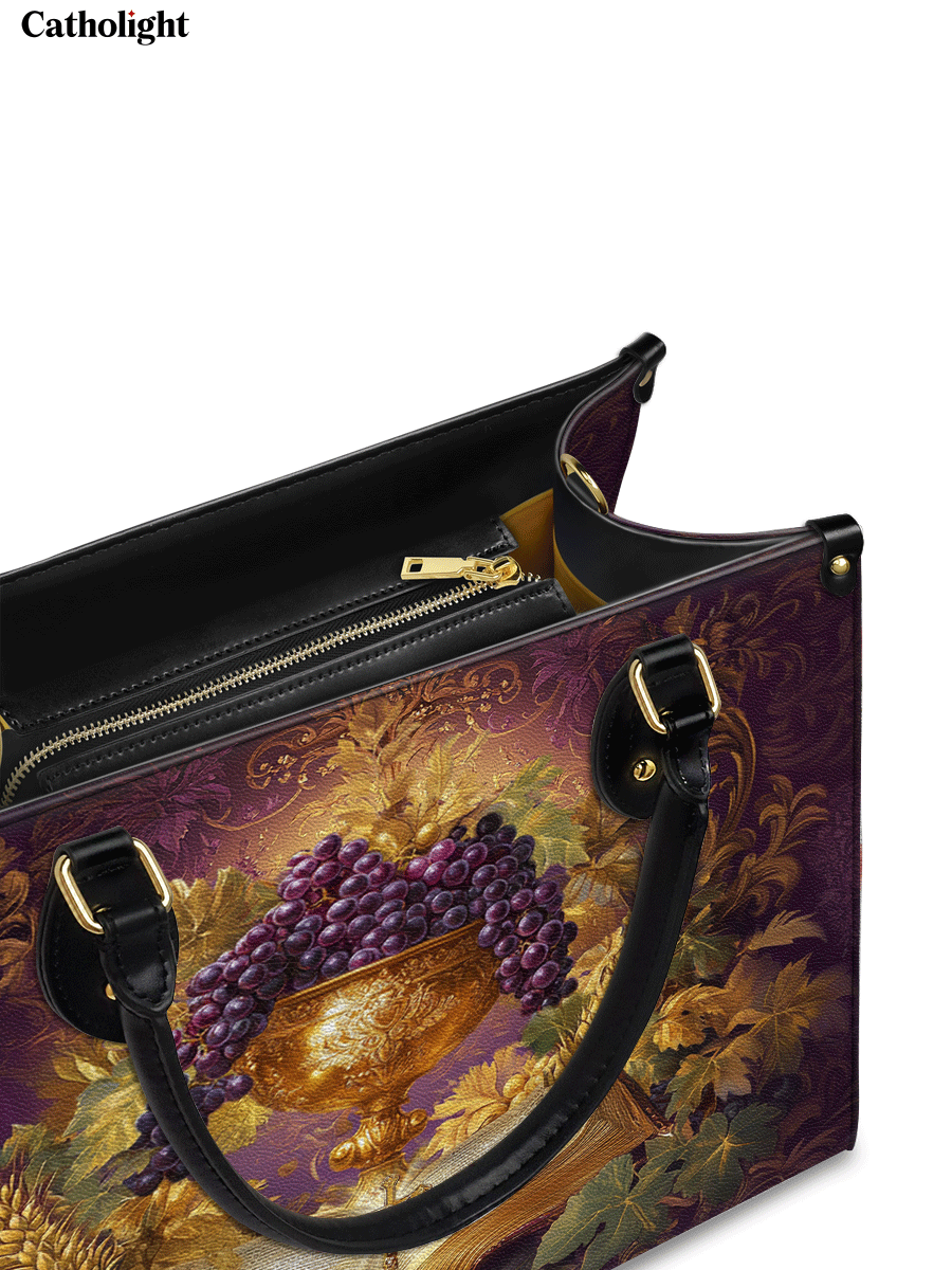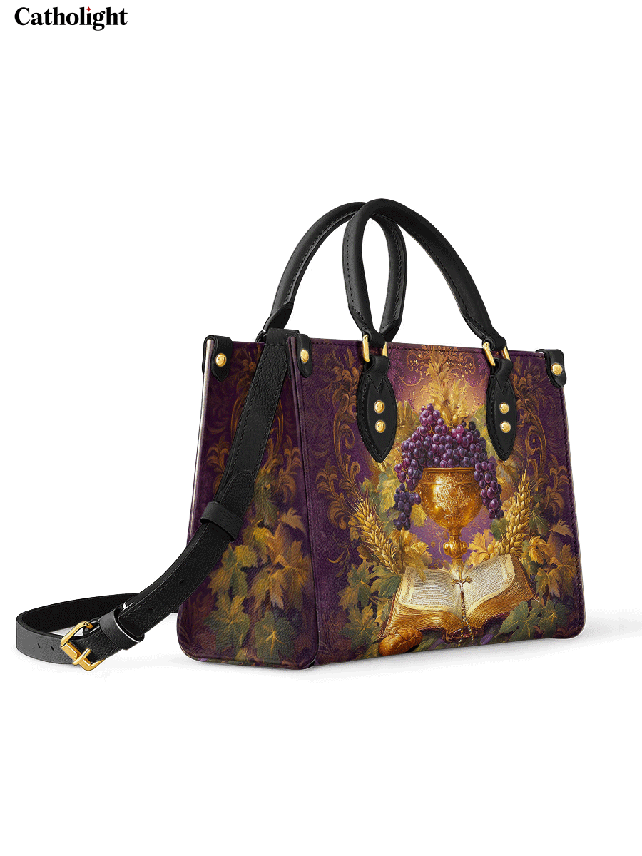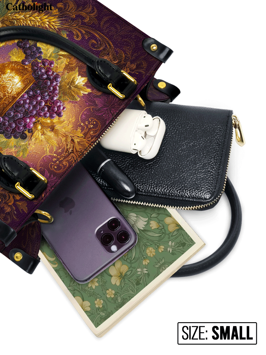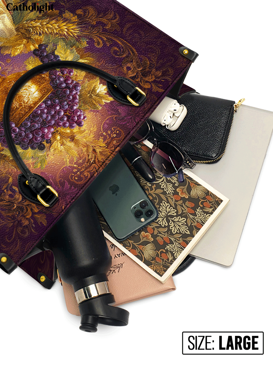 This stunning leather bag is a tribute to the sacred elements of the Eucharist, blending artistry and spirituality into an extraordinary design. At the center of the composition stands a golden chalice, adorned with cascading grapes, symbolizing the wine of the covenant and the blood of Christ. Surrounding the chalice are rich stalks of wheat, representing the bread of life, creating a harmonious depiction of abundance and divine grace.