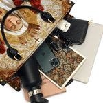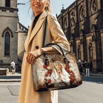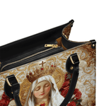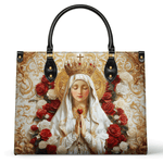 The Lady of Fatima Elegance Leather Bag is a stunning fusion of faith and luxury, featuring a breathtaking Renaissance-Baroque depiction of Our Lady of Fatima in prayer. She is adorned in a flowing white robe with golden embroidery, crowned in regal splendor, and encircled by vibrant red and white roses, symbolizing love, purity, and divine grace. The ornate golden background adds a touch of sacred opulence, evoking the grandeur of classic religious art.