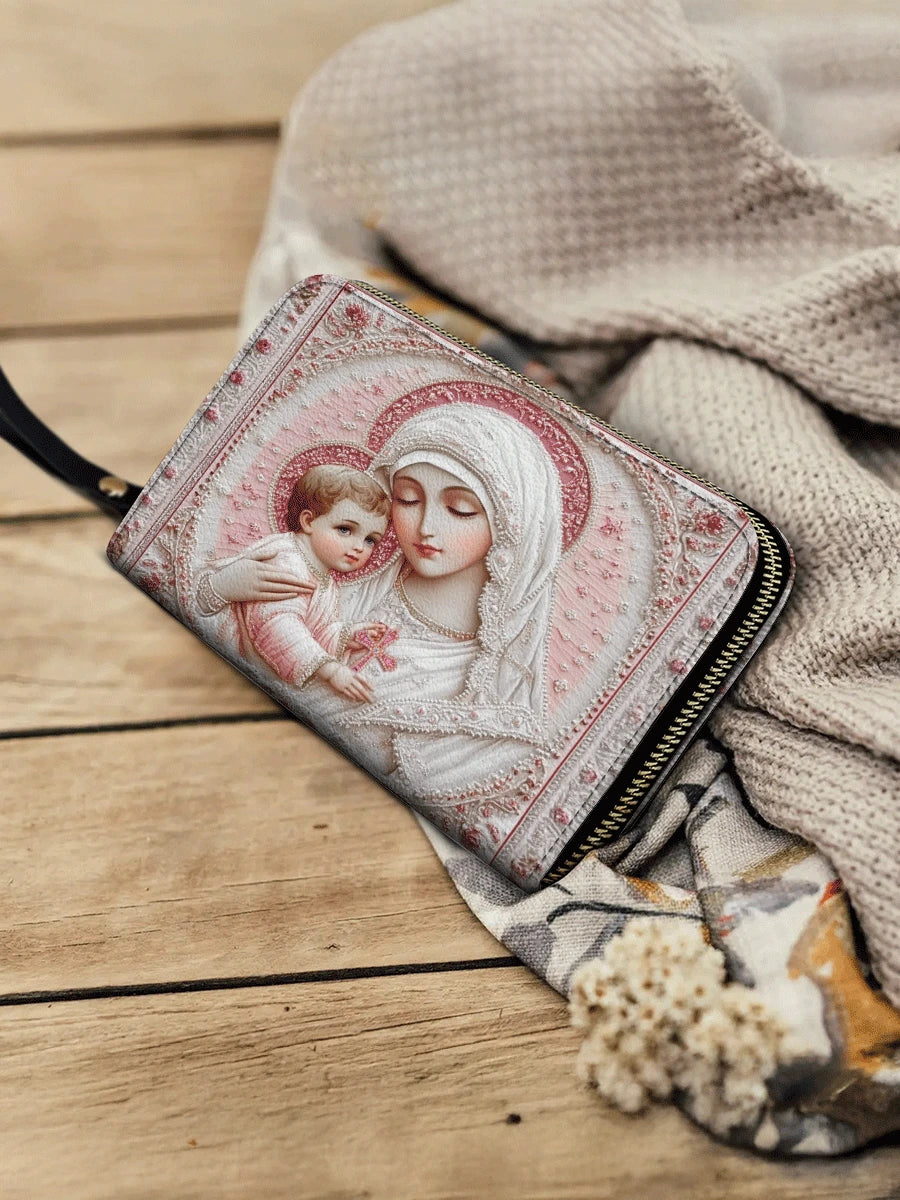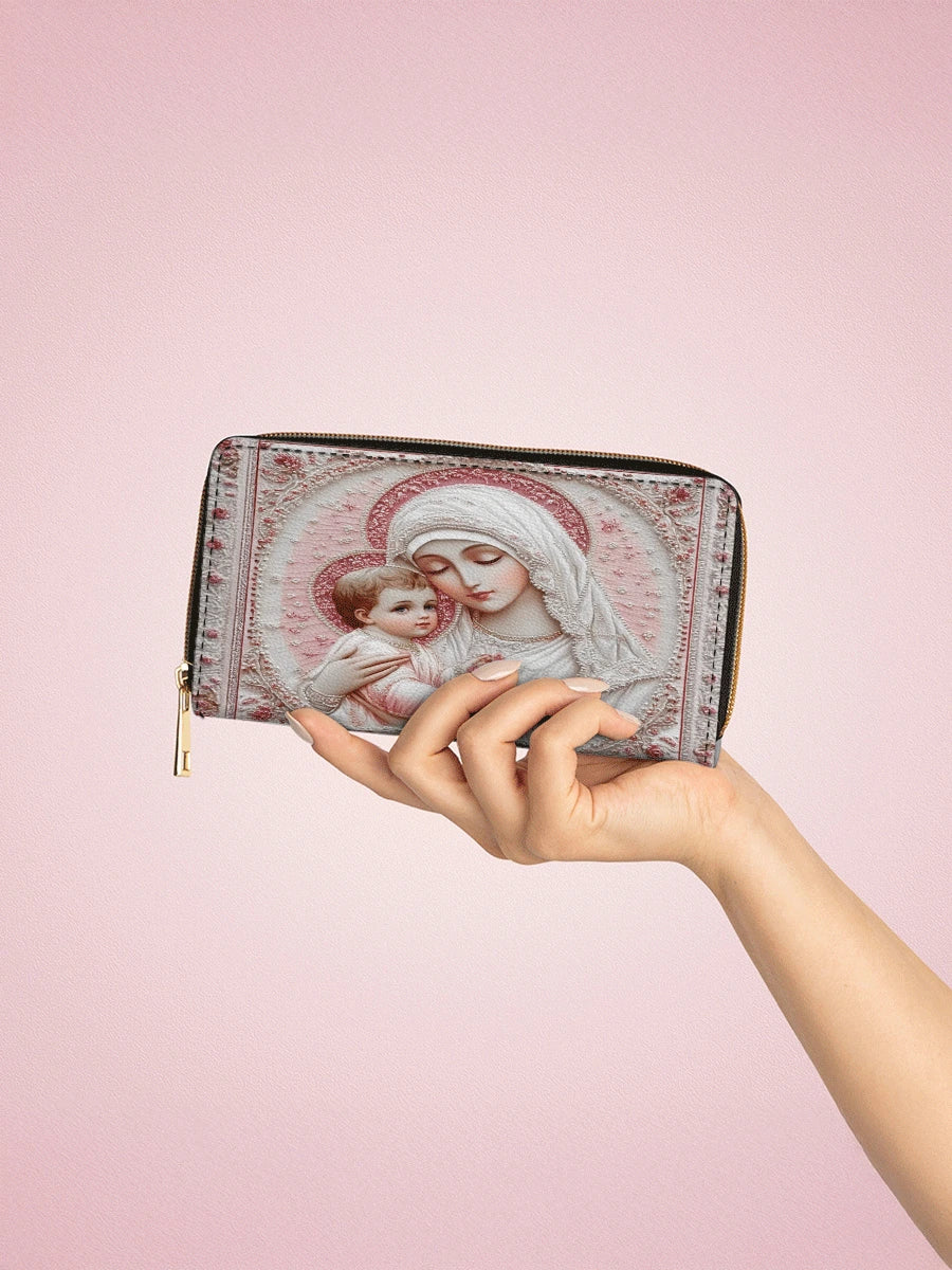 Catholight Sacred Serenity: The Madonna’s Tender Embrace - Leather Wallet Purse