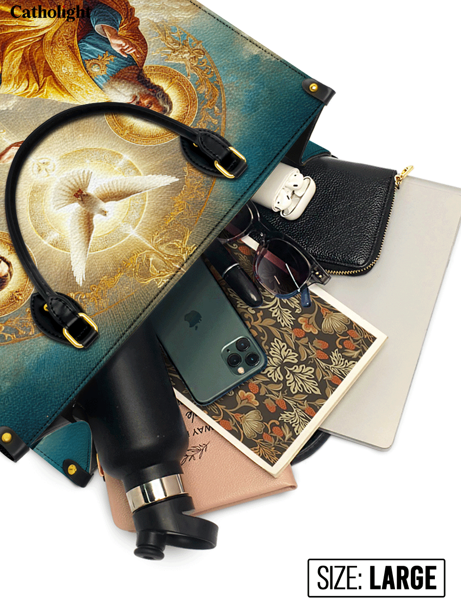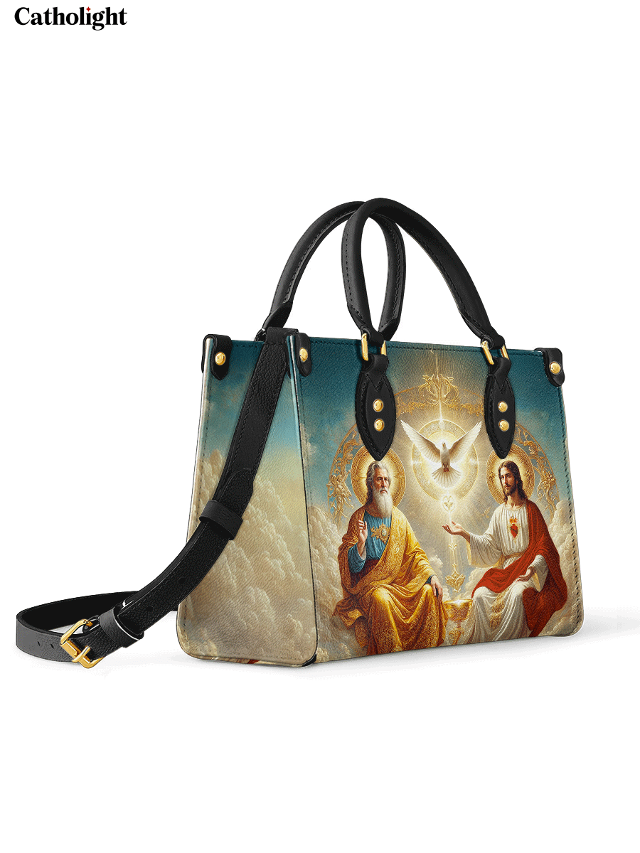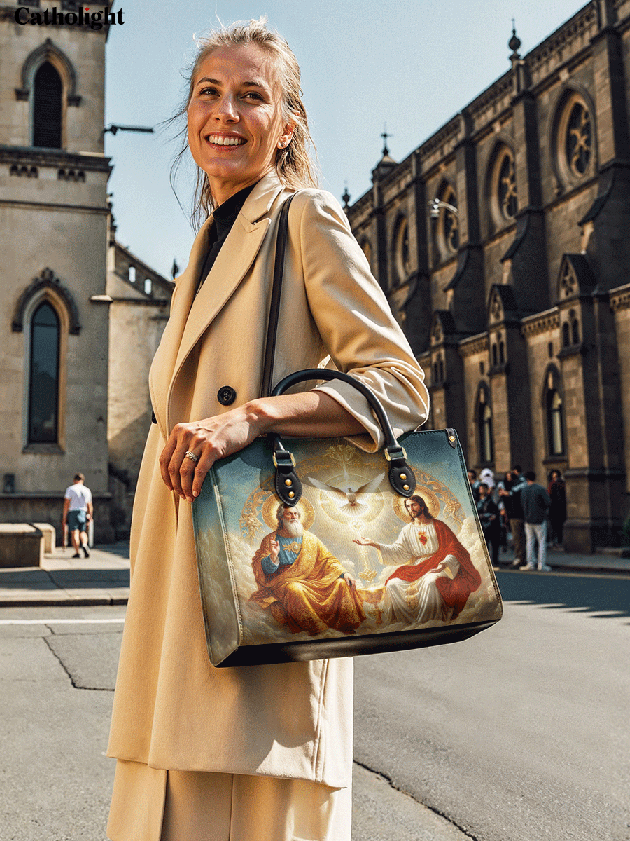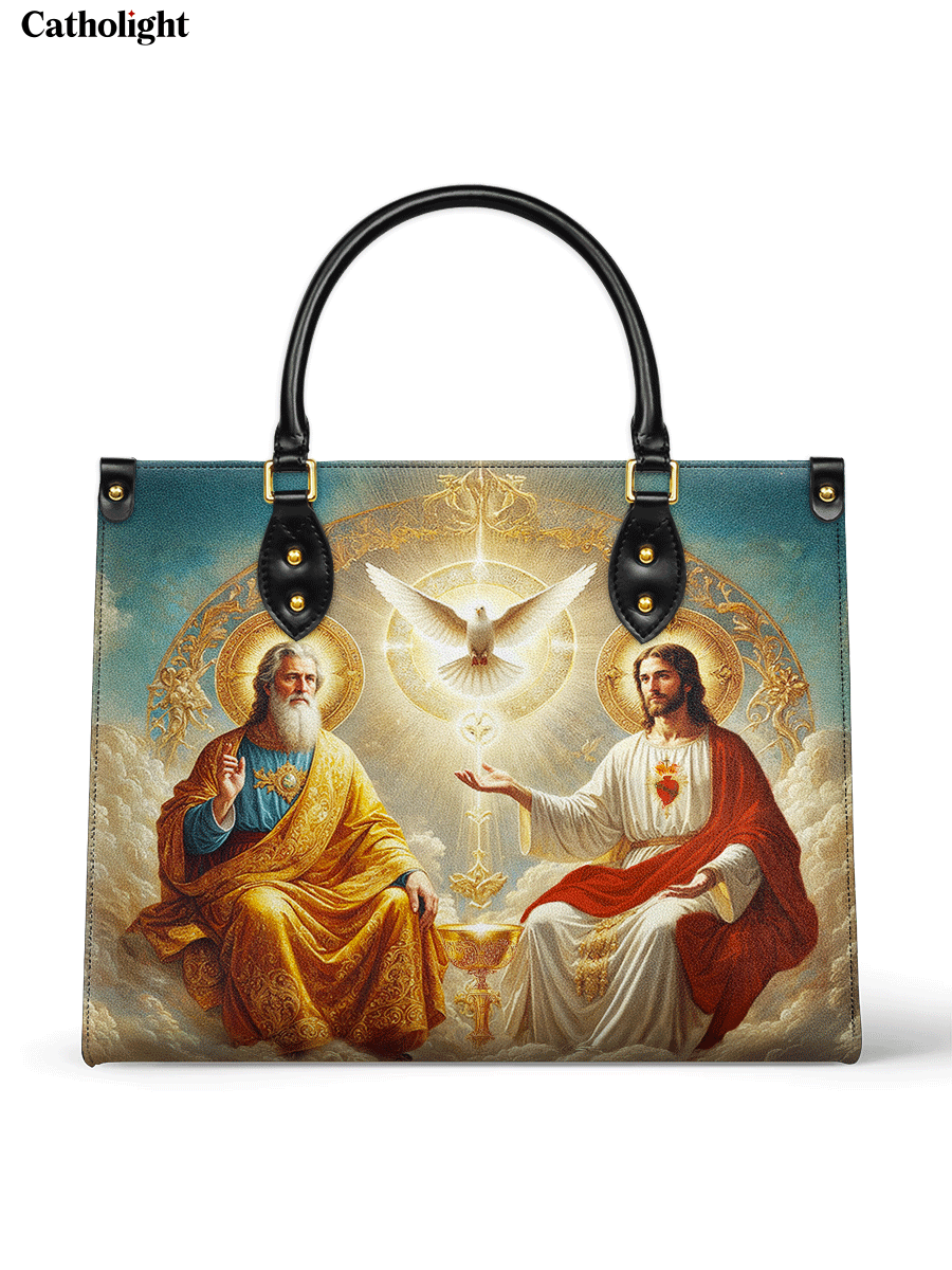 This exquisitely designed leather bag captures the profound essence of the Holy Trinity, blending artistic mastery with deep spiritual meaning. At the center, the Holy Spirit is depicted as a radiant dove, surrounded by divine light, representing peace, guidance, and sanctity. Below, God the Father, in majestic golden robes, embodies wisdom and eternal love, while Christ the Son, adorned in red and white, signifies sacrifice, salvation, and divine mercy.