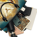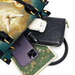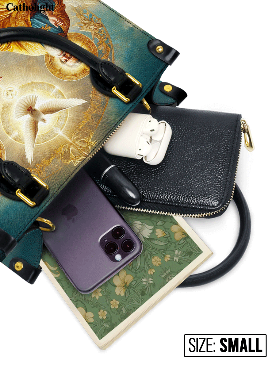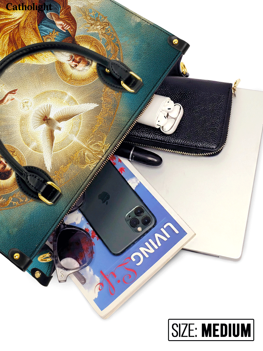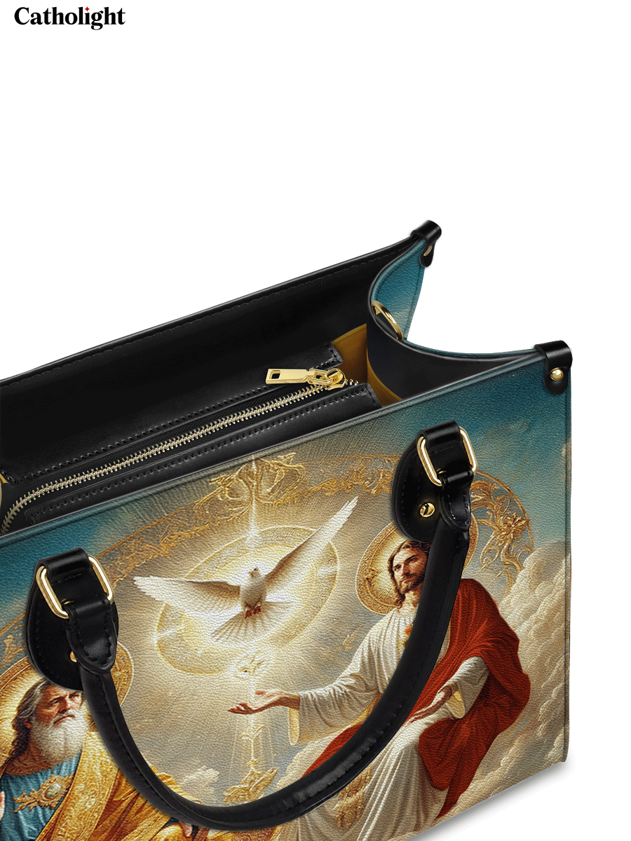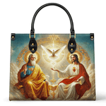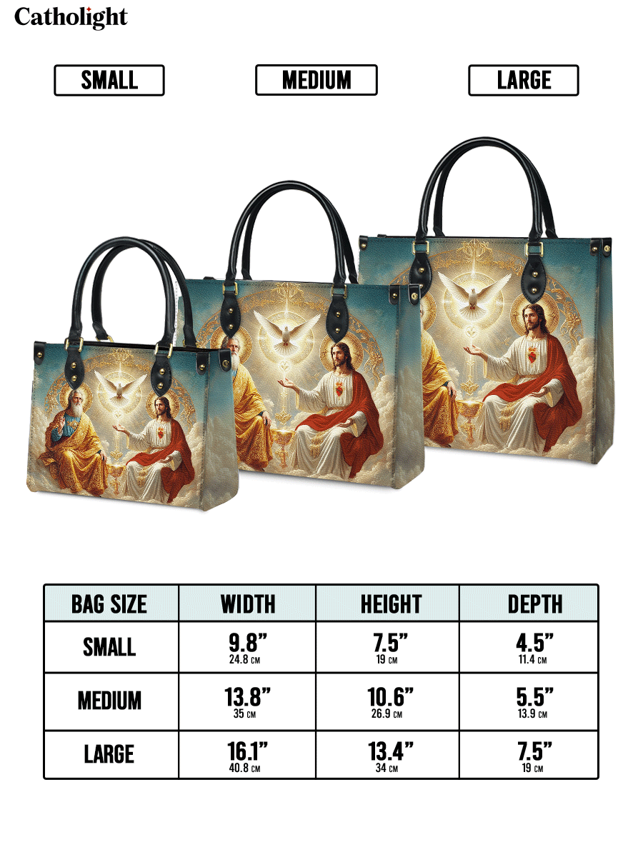 This exquisitely designed leather bag captures the profound essence of the Holy Trinity, blending artistic mastery with deep spiritual meaning. At the center, the Holy Spirit is depicted as a radiant dove, surrounded by divine light, representing peace, guidance, and sanctity. Below, God the Father, in majestic golden robes, embodies wisdom and eternal love, while Christ the Son, adorned in red and white, signifies sacrifice, salvation, and divine mercy.