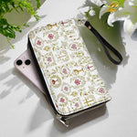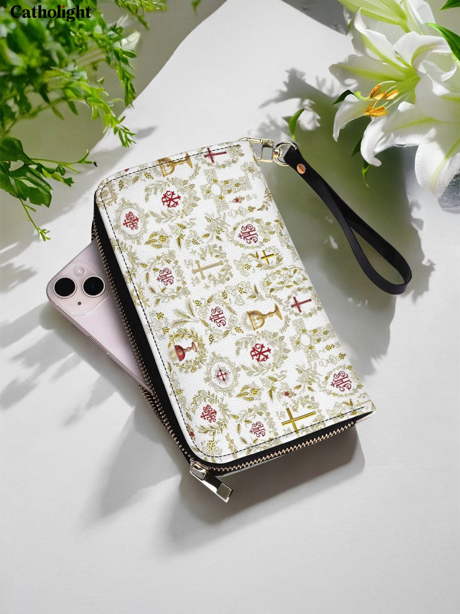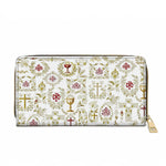 This beautifully designed wallet showcases a graceful pattern of Christian symbols, including the cross, chalice, Eucharistic host, and sacred monograms. Accented with gold and deep red, the intricate details are framed by floral and vine motifs, reflecting the richness and spiritual depth of Catholic tradition. This design exudes reverence and elegance, making it a meaningful expression of faith.