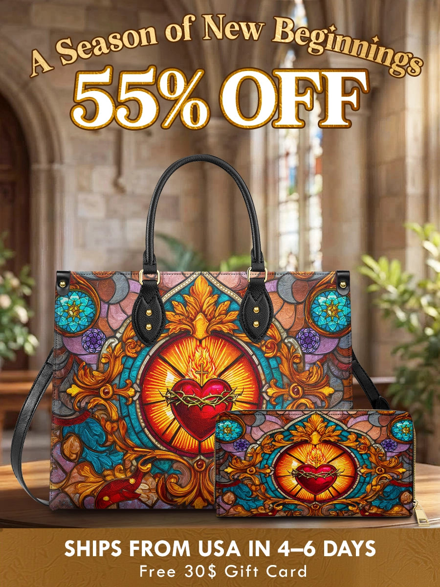 This exquisite handbag showcases the Sacred Heart of Jesus in luminous stained glass artistry — a timeless symbol of divine love, sacrifice, and mercy. The radiant heart, crowned with thorns and glowing with heavenly light, stands as a reminder of Christ’s unfailing compassion.