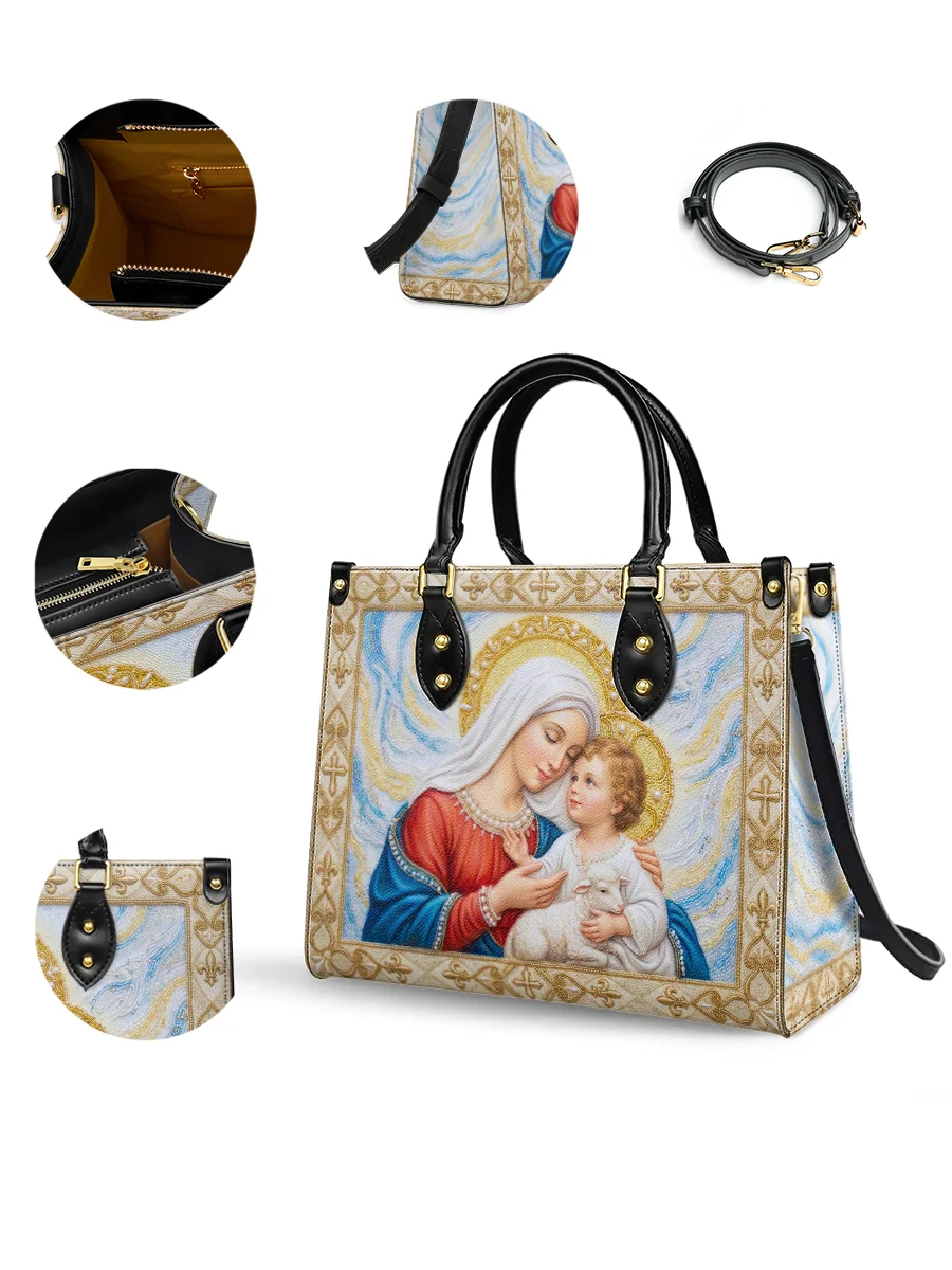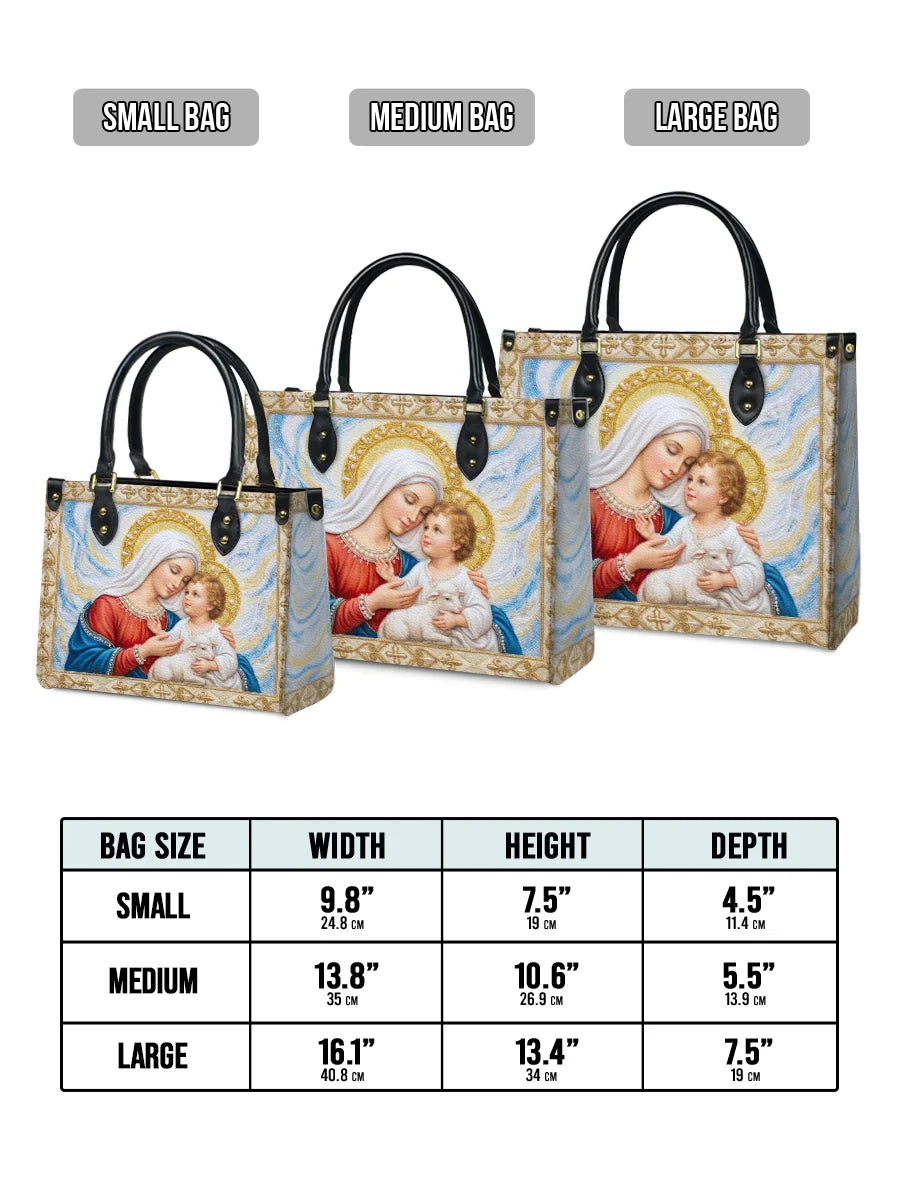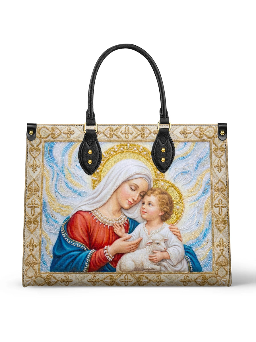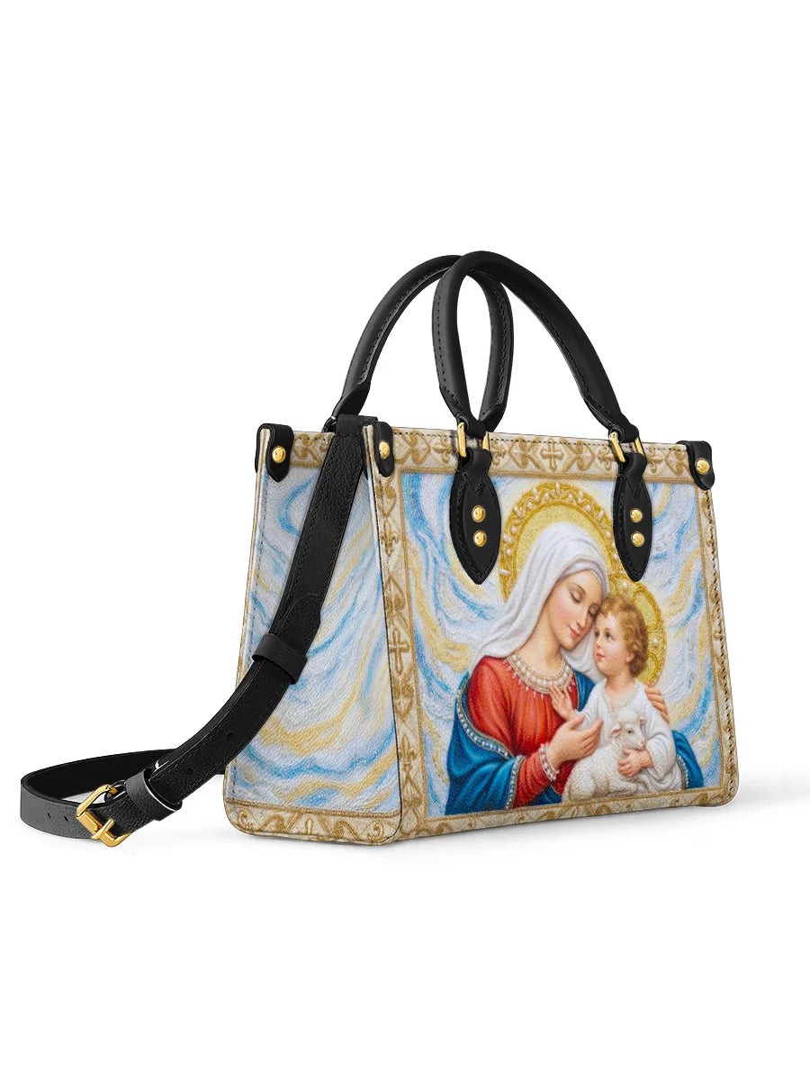 This exquisite bag features a tender and heartwarming depiction of the Virgin Mary with the Child Jesus, captured in a moment of deep love and gentle protection. Mary inclines her head softly toward the Child, her expression serene and full of maternal affection, while the Christ Child gazes back with trust and innocence. Cradled in Mary’s arms is a small lamb, symbolizing purity, sacrifice, and Christ as the Lamb of God.