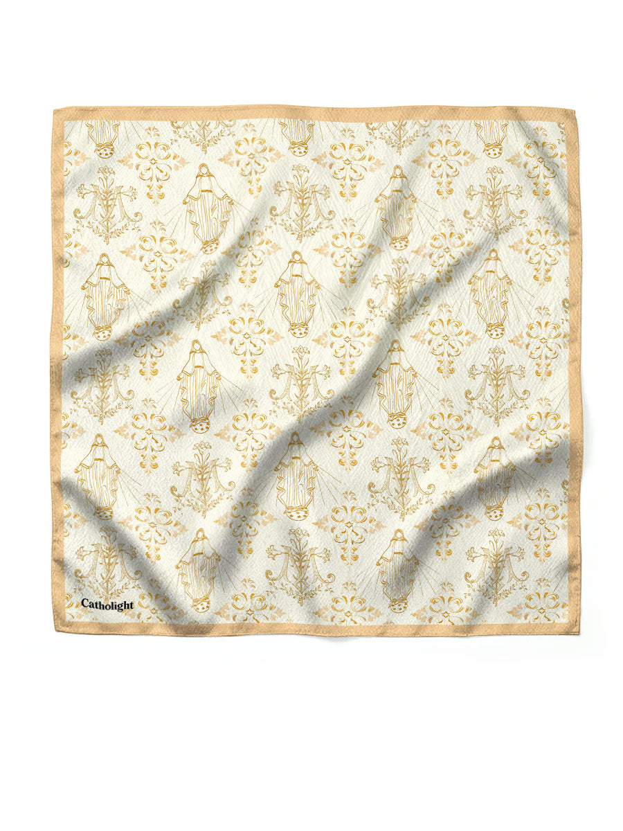 Crafted from Woodgrain Silk, this 70x70cm square scarf glows with a soft, luminous texture — elegant yet quietly powerful. Lightweight and smooth, it drapes effortlessly for prayer, Sunday Mass, or as a meaningful daily accessory.