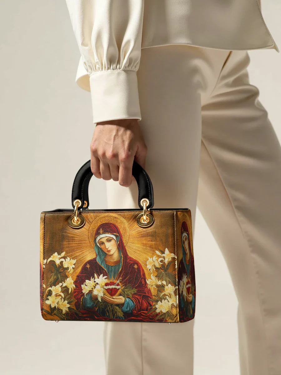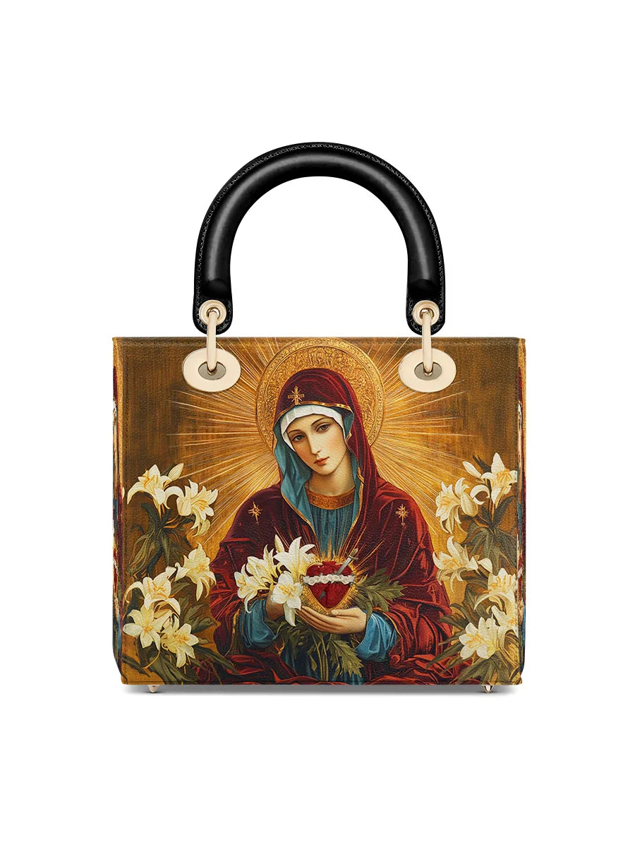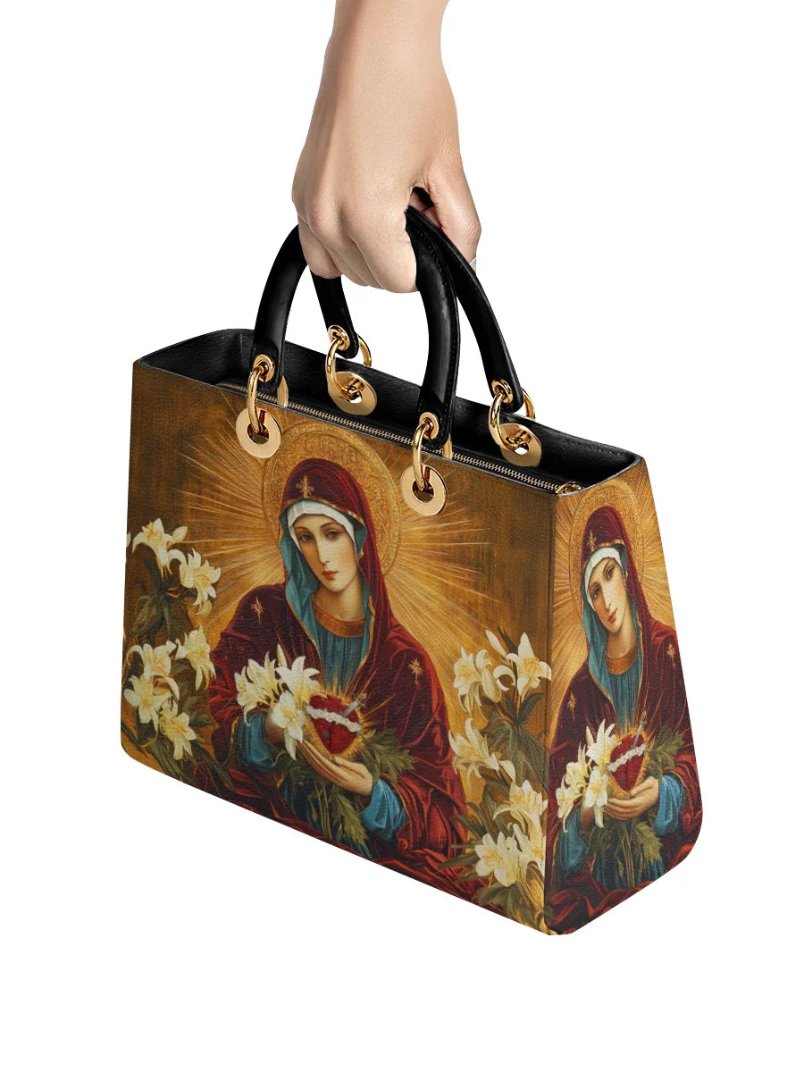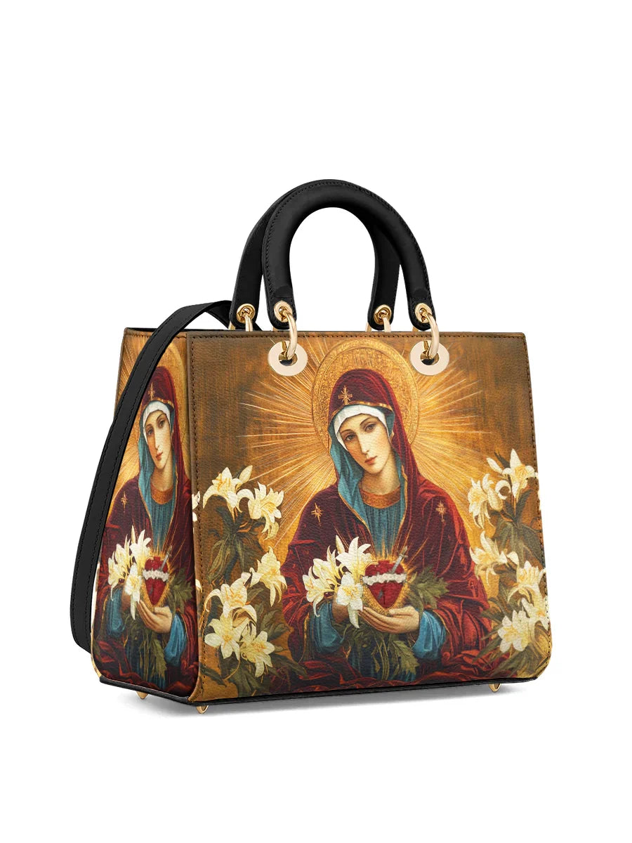 Diese Ledertasche ist eine atemberaubende Darstellung der Jungfrau Maria, die göttliche Liebe und Reinheit ausstrahlt. Das Design zeigt Marias Unbeflecktes Herz, umgeben von leuchtenden goldenen Strahlen und eingerahmt von zarten weißen Lilien, die Anmut und Hingabe symbolisieren. Ihr friedvoller Ausdruck und die filigranen Details des Kunstwerks machen es zu einem bezaubernden Schmuckstück, das tief im Herzen berührt.