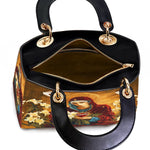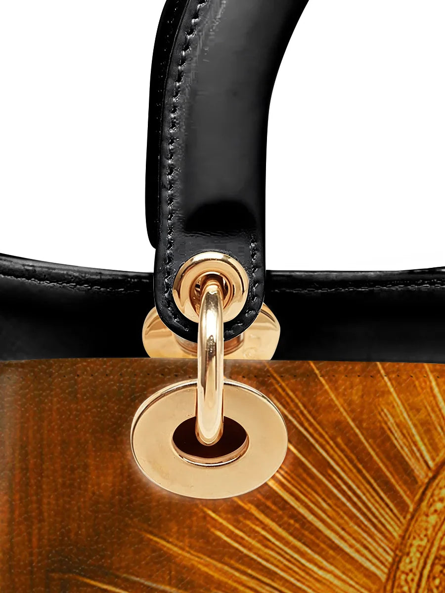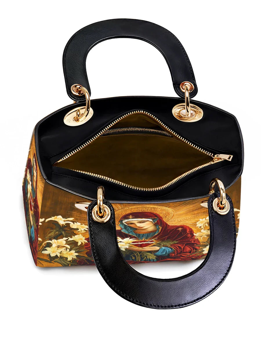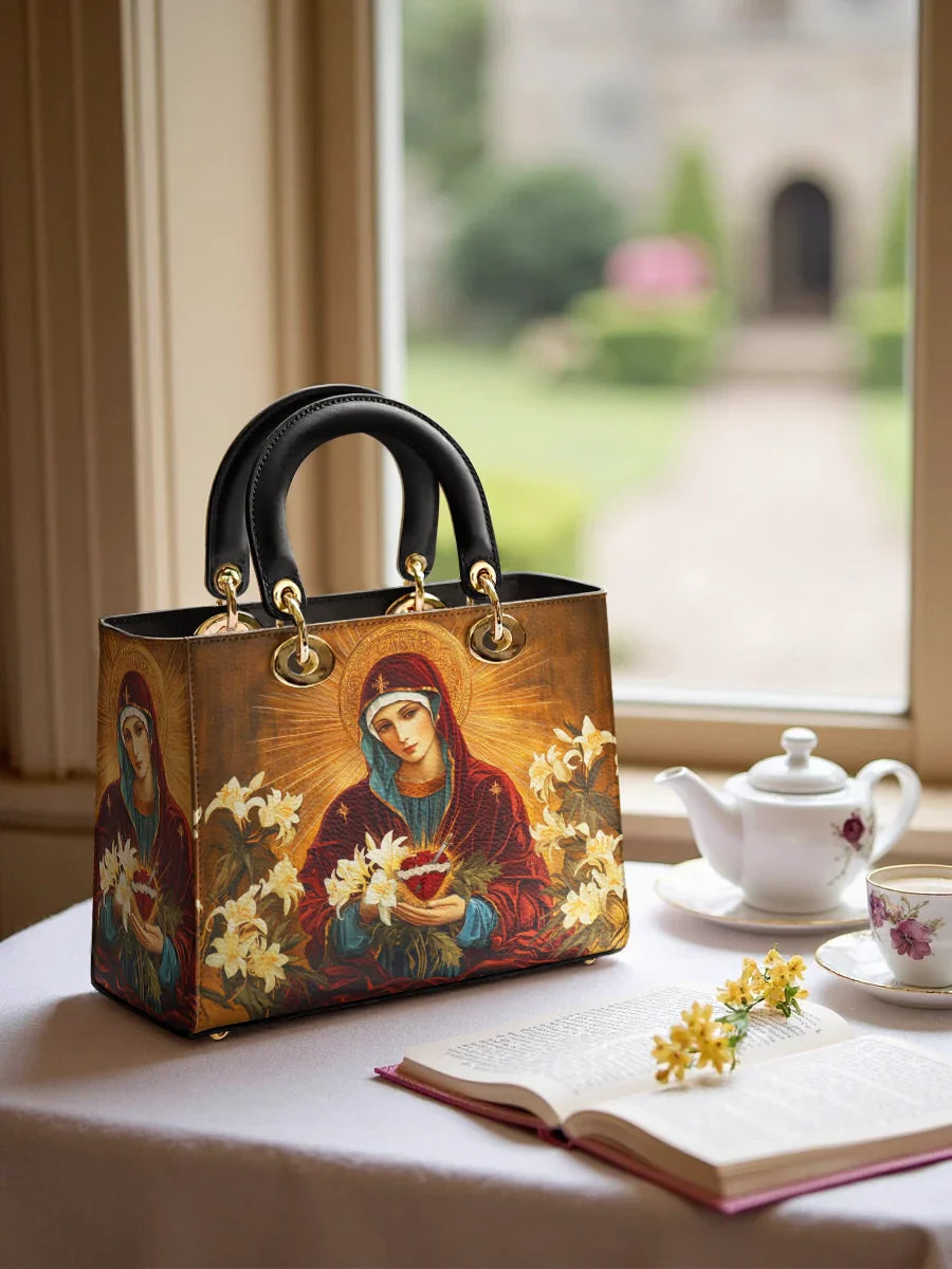 Diese Ledertasche ist eine atemberaubende Darstellung der Jungfrau Maria, die göttliche Liebe und Reinheit ausstrahlt. Das Design zeigt Marias Unbeflecktes Herz, umgeben von leuchtenden goldenen Strahlen und eingerahmt von zarten weißen Lilien, die Anmut und Hingabe symbolisieren. Ihr friedvoller Ausdruck und die filigranen Details des Kunstwerks machen es zu einem bezaubernden Schmuckstück, das tief im Herzen berührt.