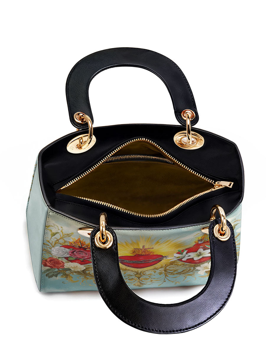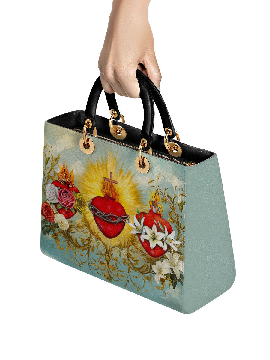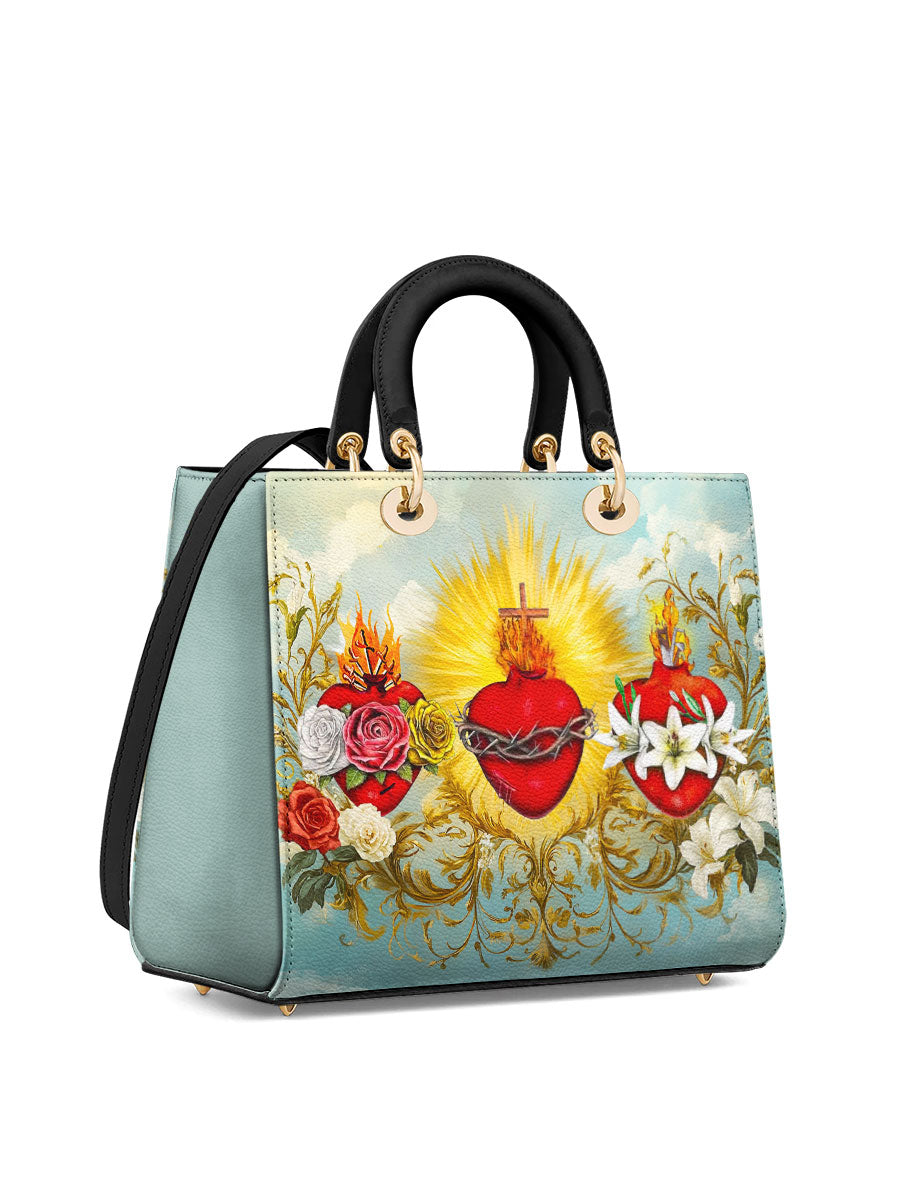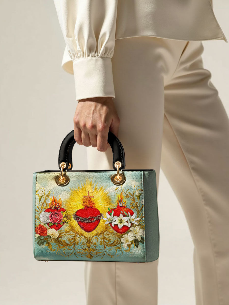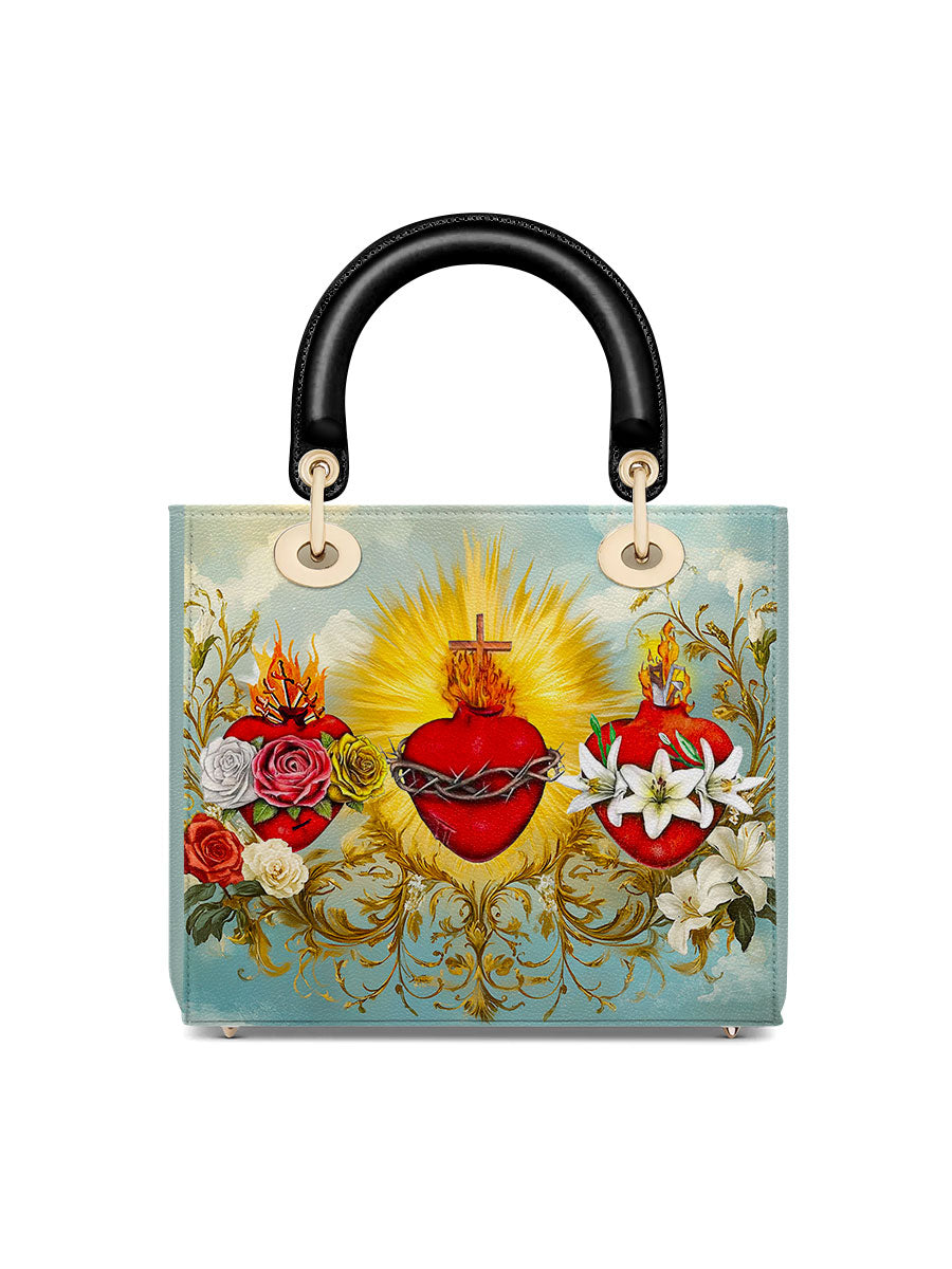 Diese elegante Lederhandtasche besticht durch ein tiefgründiges, symbolträchtiges Motiv der Drei Heiligen Herzen: das Heiligste Herz Jesu, das Unbefleckte Herz Mariens und das Reinste Herz des Heiligen Josef. Jedes Herz ist von üppigen Details umgeben – Rosen, Lilien, Dornen und Flammen –, die Liebe, Opferbereitschaft, Reinheit und Schutz symbolisieren. Goldene Verzierungen und der sanfte himmelblaue Hintergrund verleihen der Komposition einen himmlischen Glanz und lassen sie lebendig wirken.