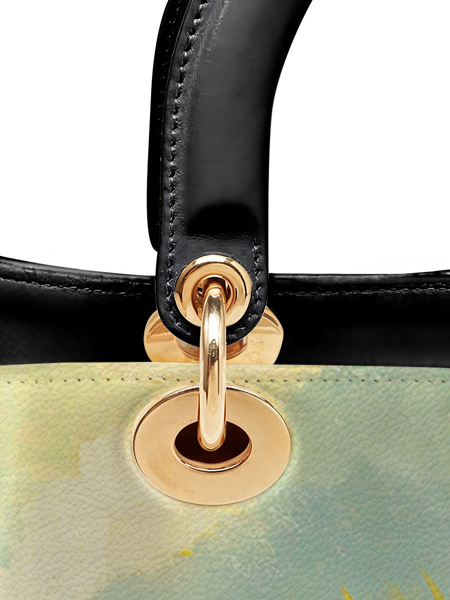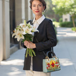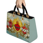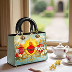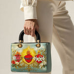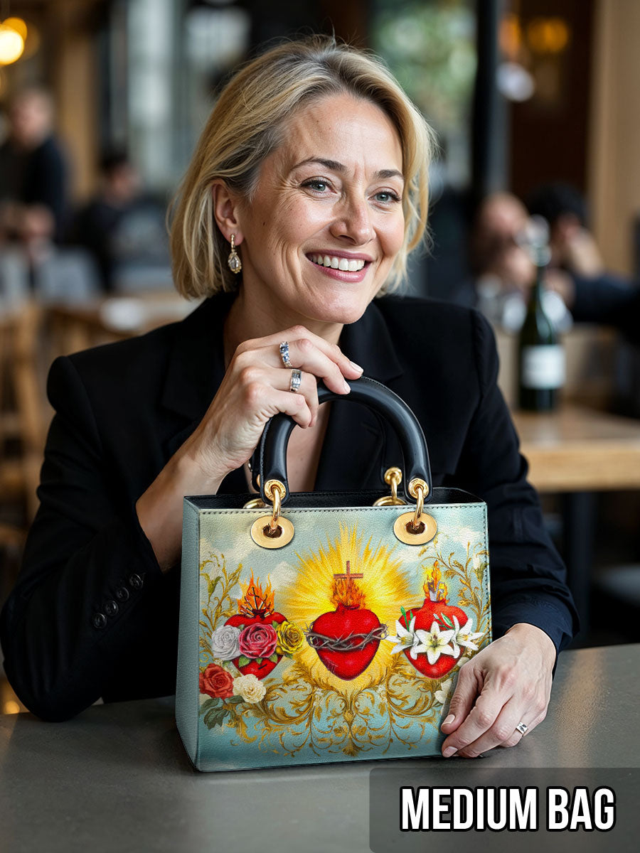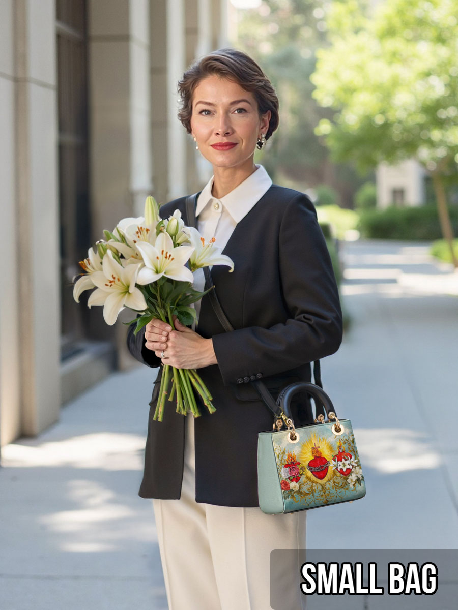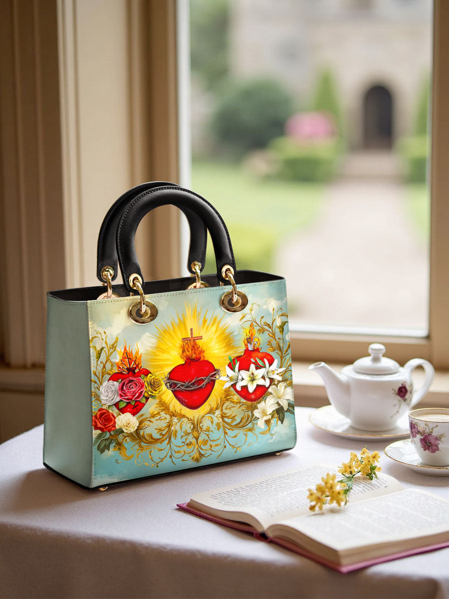 Diese elegante Lederhandtasche besticht durch ein tiefgründiges, symbolträchtiges Motiv der Drei Heiligen Herzen: das Heiligste Herz Jesu, das Unbefleckte Herz Mariens und das Reinste Herz des Heiligen Josef. Jedes Herz ist von üppigen Details umgeben – Rosen, Lilien, Dornen und Flammen –, die Liebe, Opferbereitschaft, Reinheit und Schutz symbolisieren. Goldene Verzierungen und der sanfte himmelblaue Hintergrund verleihen der Komposition einen himmlischen Glanz und lassen sie lebendig wirken.
