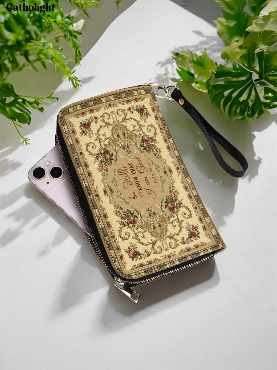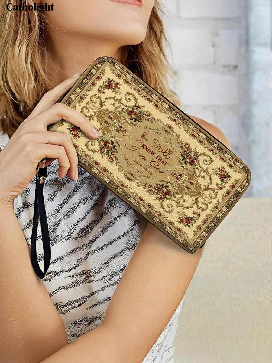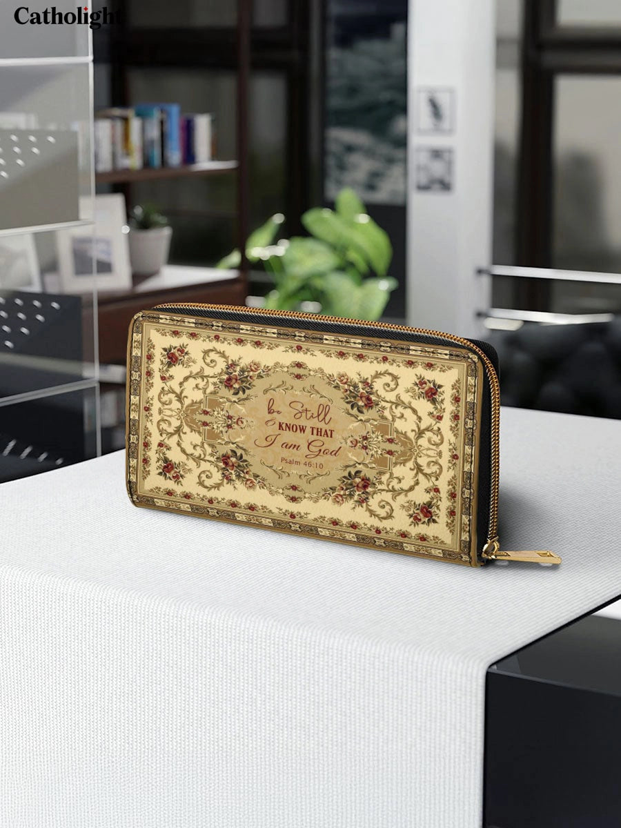 Dieses wunderschön gearbeitete Portemonnaie zeigt den tröstenden Vers „Seid still und erkennt, dass ich Gott bin“ aus Psalm 46:10, umrahmt von lebendigen Blumenmustern und zarten goldenen Akzenten. Die harmonische Kombination aus sanften Farben und komplizierten Details schafft einen heiteren und bedeutungsvollen Ausdruck von Glauben und Vertrauen.
