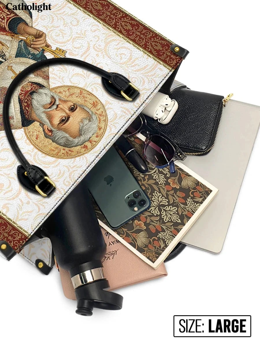 Dieses wunderschön gestaltete Kunstwerk zeigt den Heiligen Petrus, einen der bedeutendsten Apostel und den Hüter der Schlüssel zum Himmel, in einer ehrfürchtigen und königlichen Darstellung. In aufwendige Gewänder gekleidet, die mit reichem Gold und tiefen Juwelentönen geschmückt sind, hält der Heilige Petrus die symbolischen Schlüssel, die seine göttliche Autorität repräsentieren, im Himmel und auf Erden zu binden und zu lösen. In seiner anderen Hand trägt er ein Buch mit einem Kreuz, das das Evangelium und seine Rolle als Stütze der frühen Kirche symbolisiert.